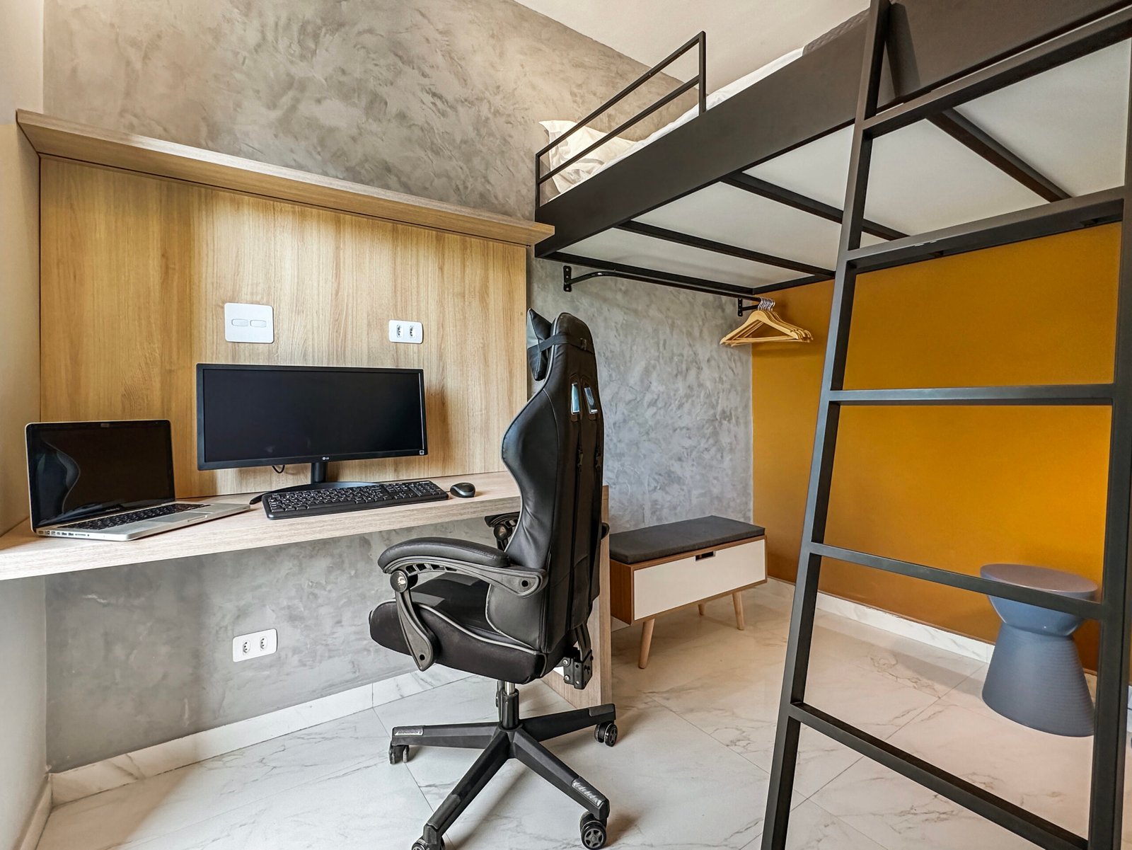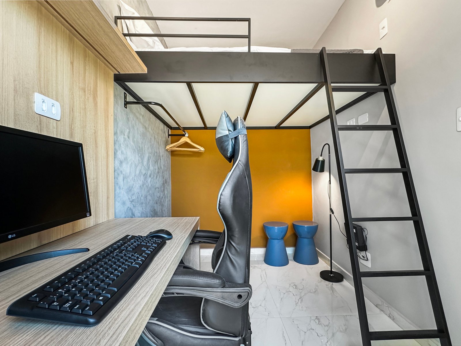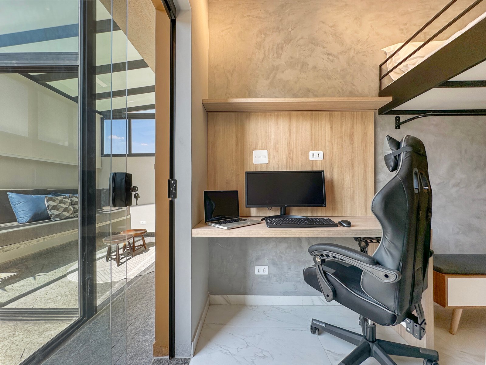 Com essa decisão, o antigo espaço da sala deu lugar a um novo quarto, pensado para tornar o projeto mais versátil e aumentar a rentabilidade do imóvel. Nesse ambiente, a arquitetura se adapta ao uso: uma cama suspensa libera o espaço inferior para um home office funcional, equilibrando conforto, praticidade e criatividade.