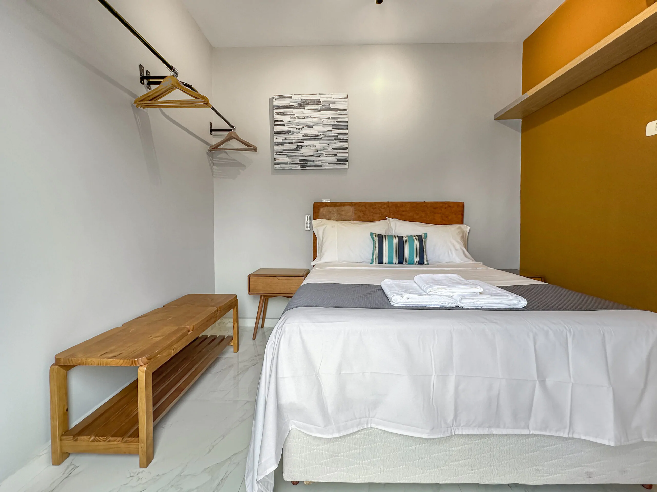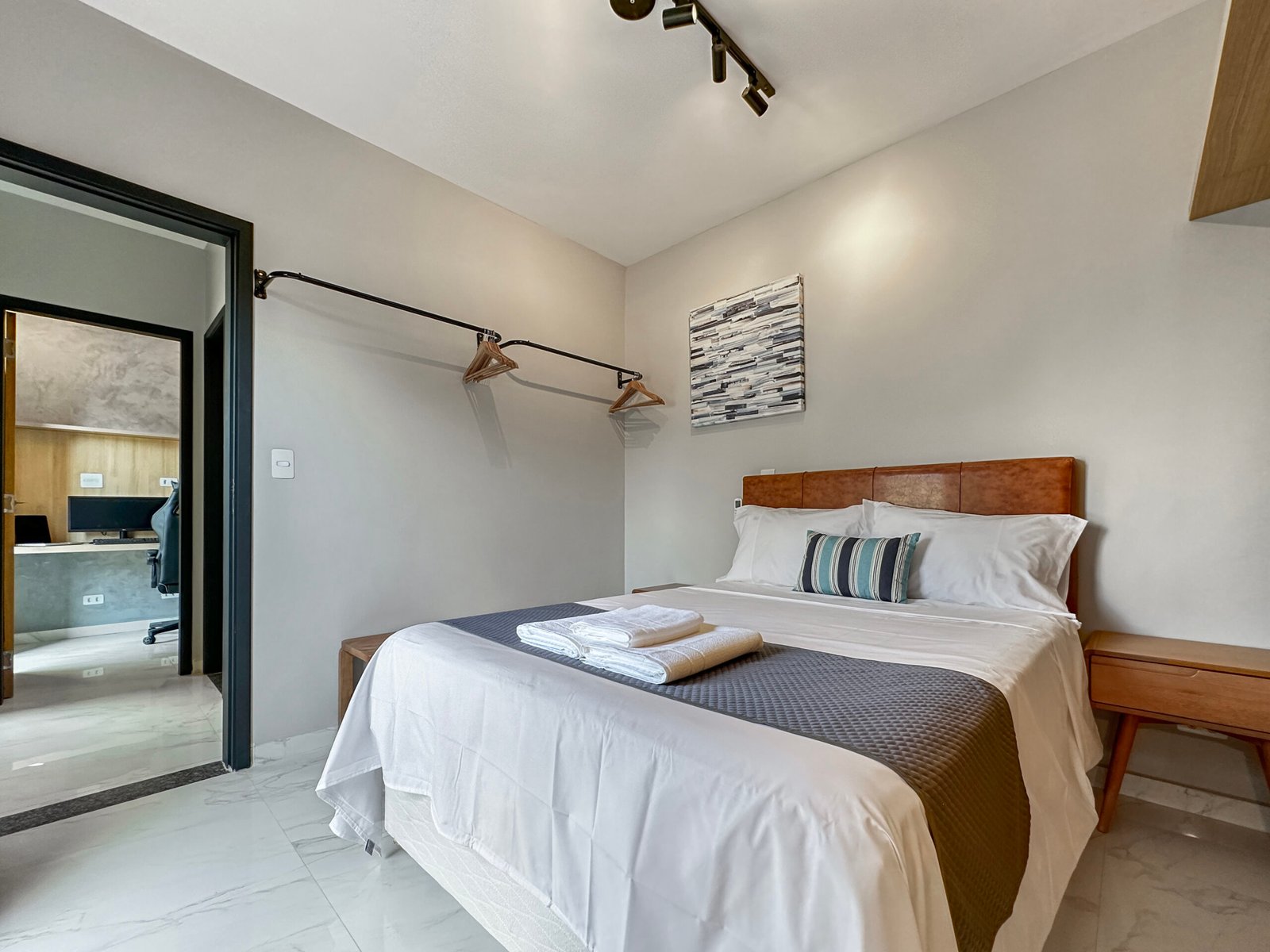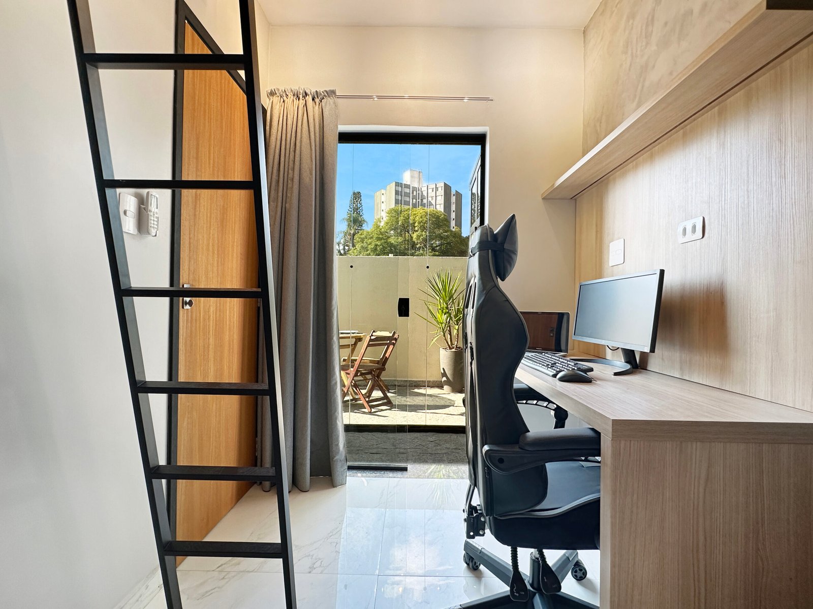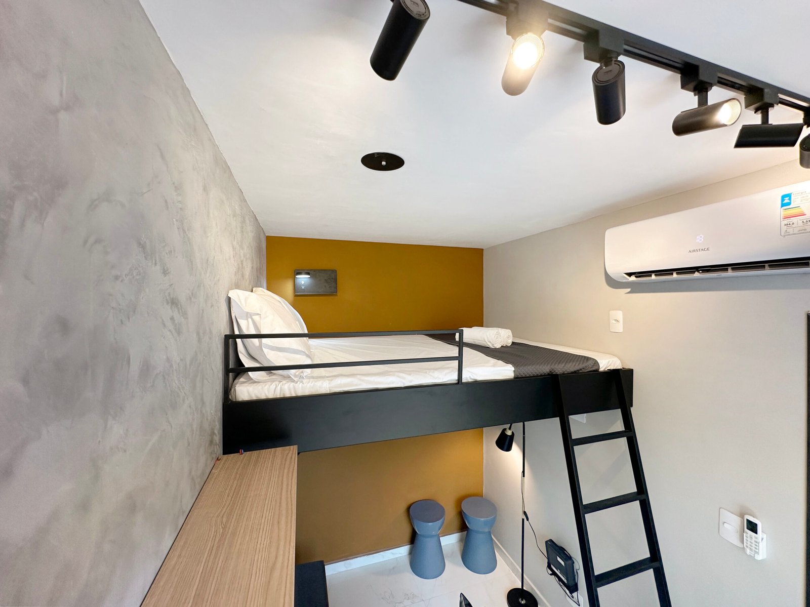 Com essa decisão, o antigo espaço da sala deu lugar a um novo quarto, pensado para tornar o projeto mais versátil e aumentar a rentabilidade do imóvel. Nesse ambiente, a arquitetura se adapta ao uso: uma cama suspensa libera o espaço inferior para um home office funcional, equilibrando conforto, praticidade e criatividade.