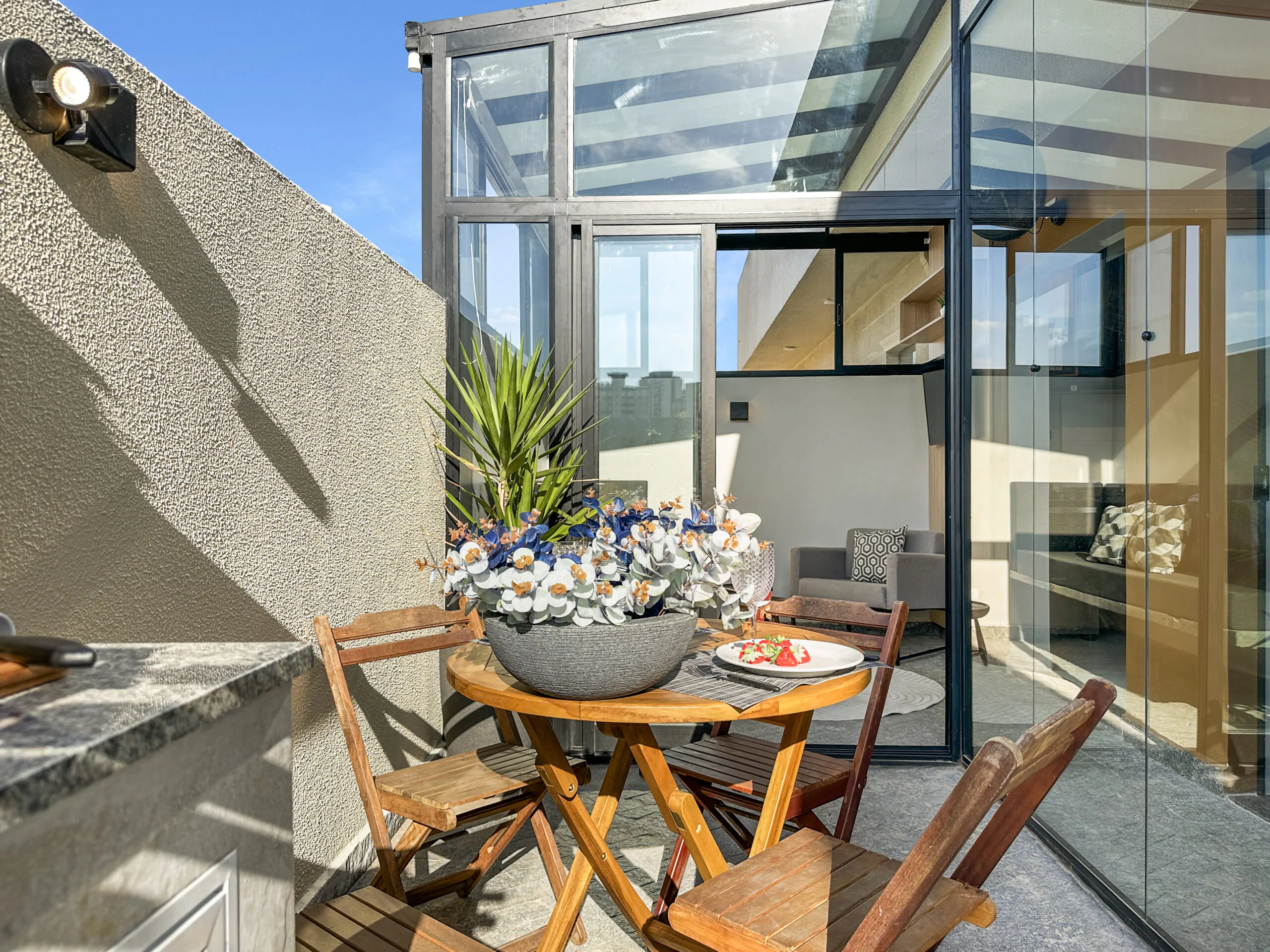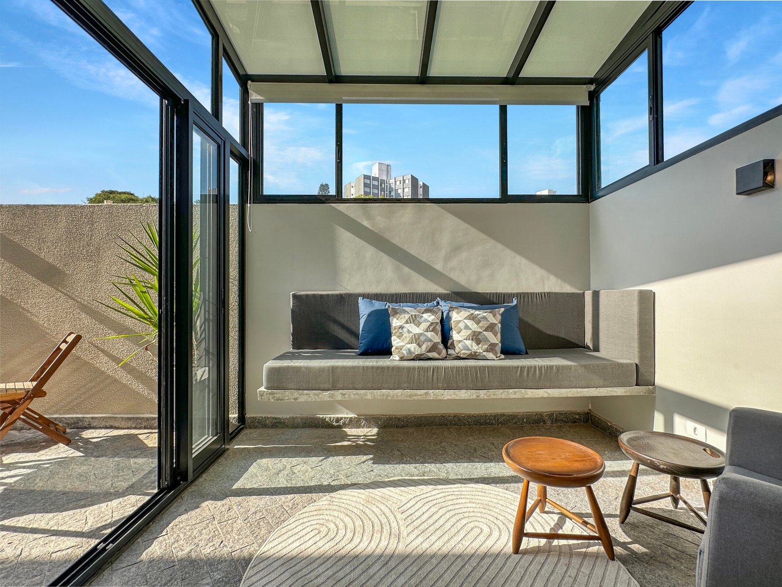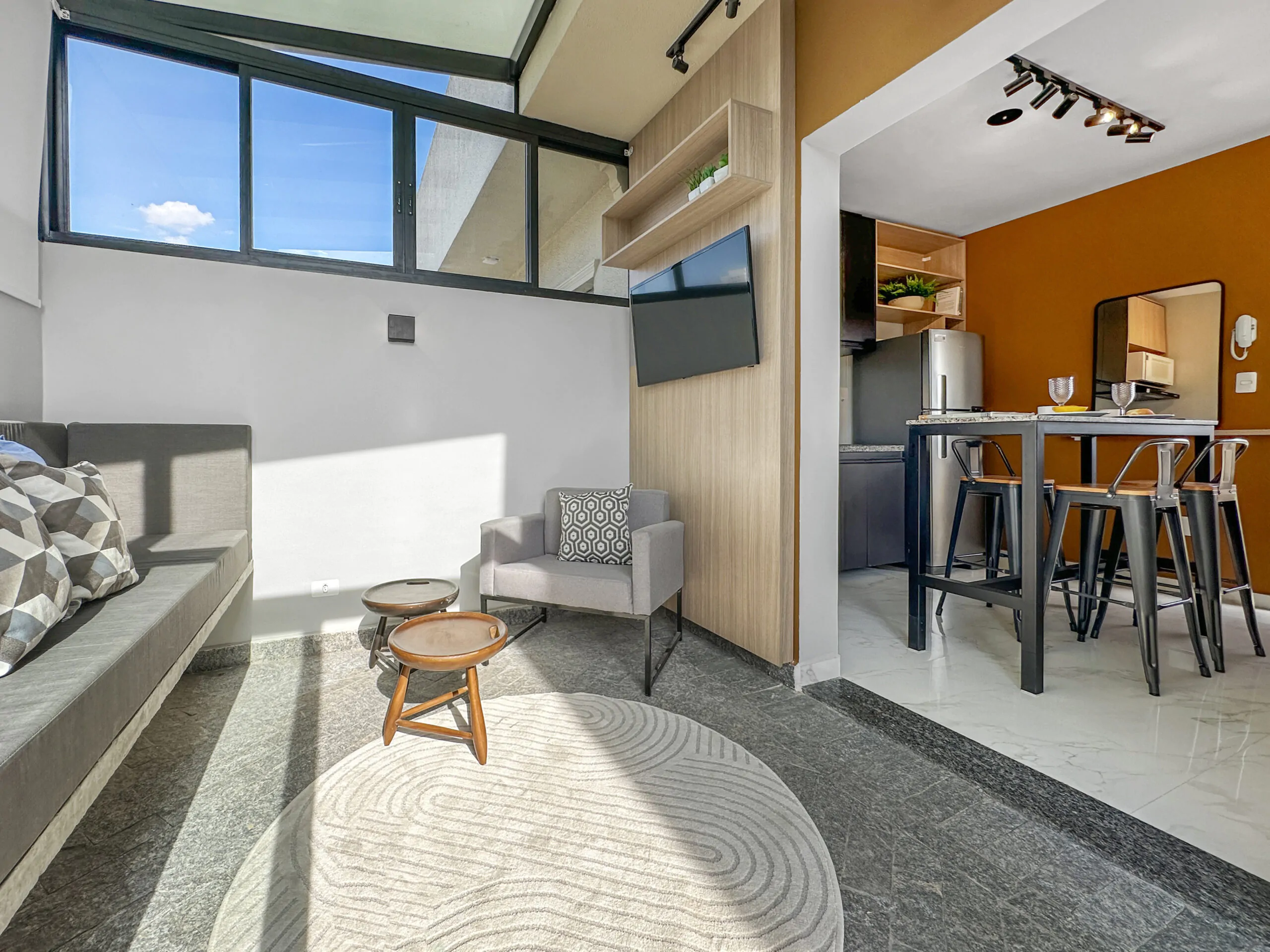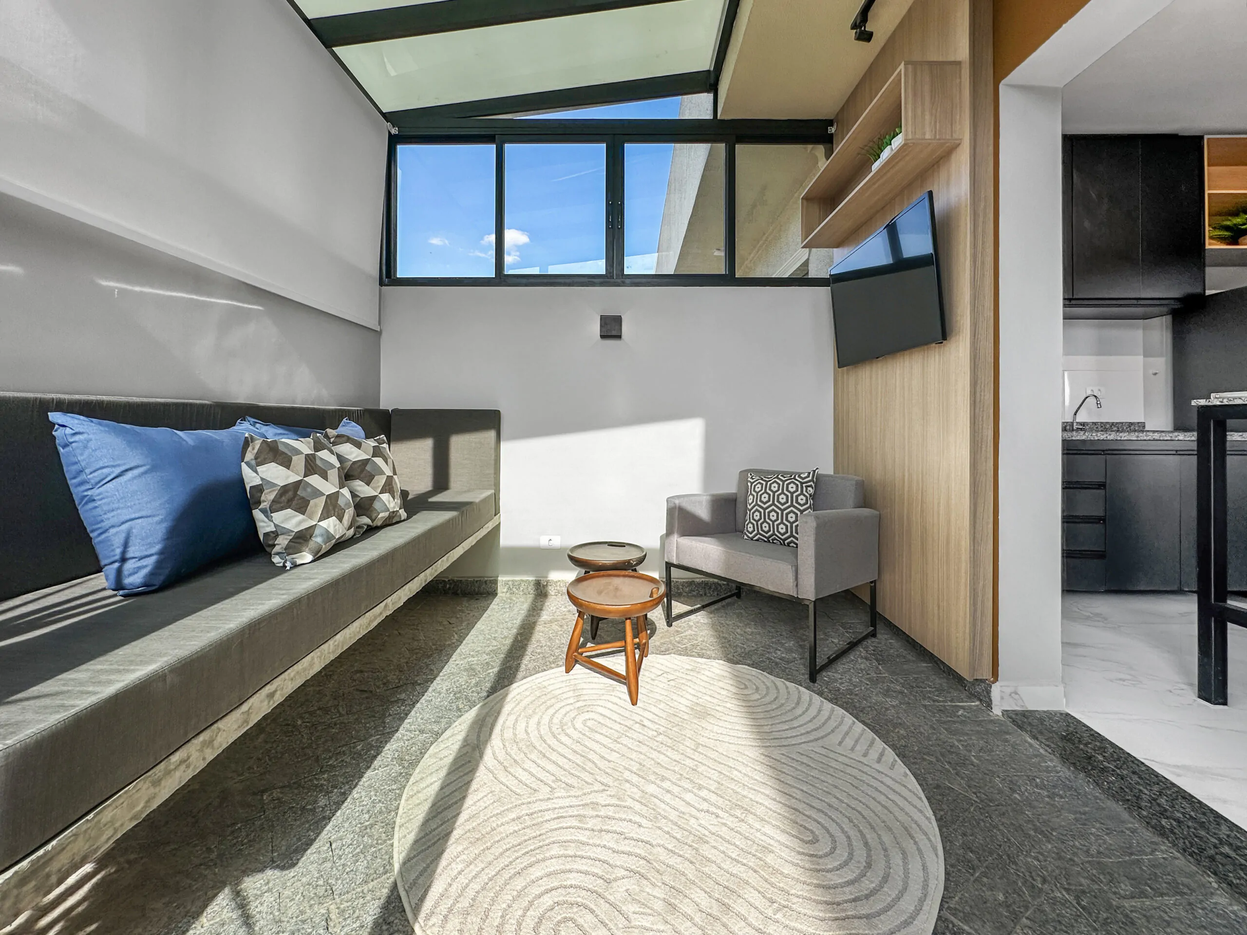 Originalmente concebido como um studio garden, este apartamento ganhou uma nova narrativa a partir do olhar estratégico para o Airbnb. Ao enxergar além da tipologia original, surgiu a ideia de transformar parte do garden em uma cobertura acolhedora, criando uma sala externa que amplia a experiência do morar — e do estar.