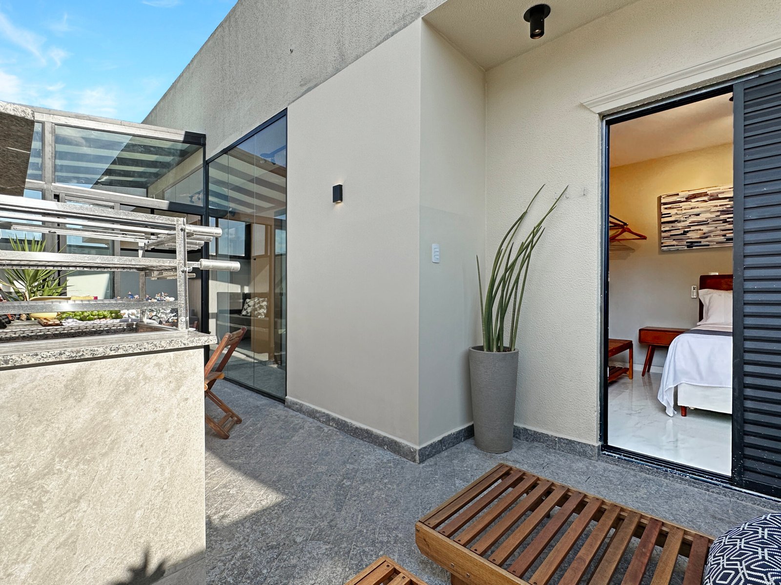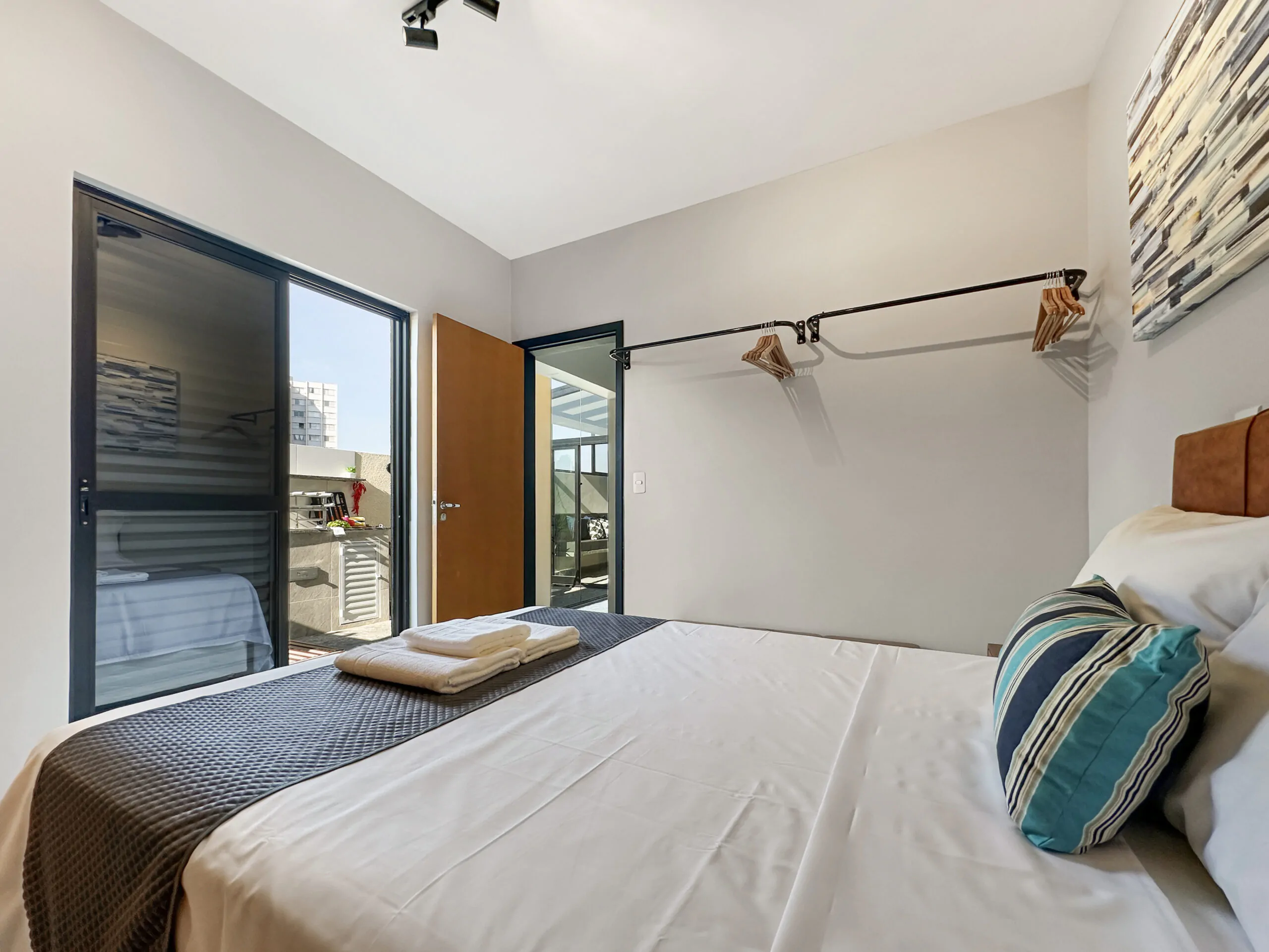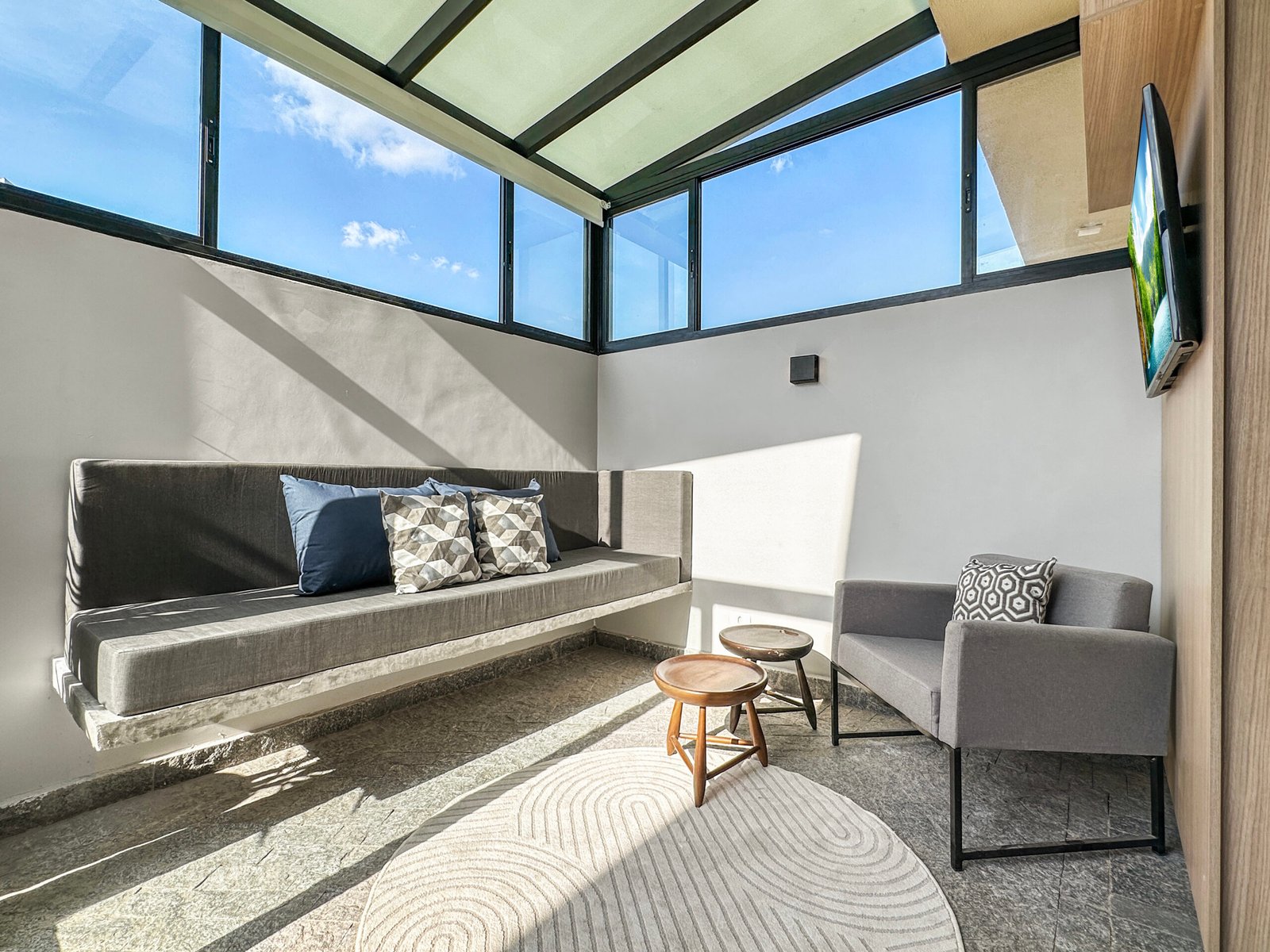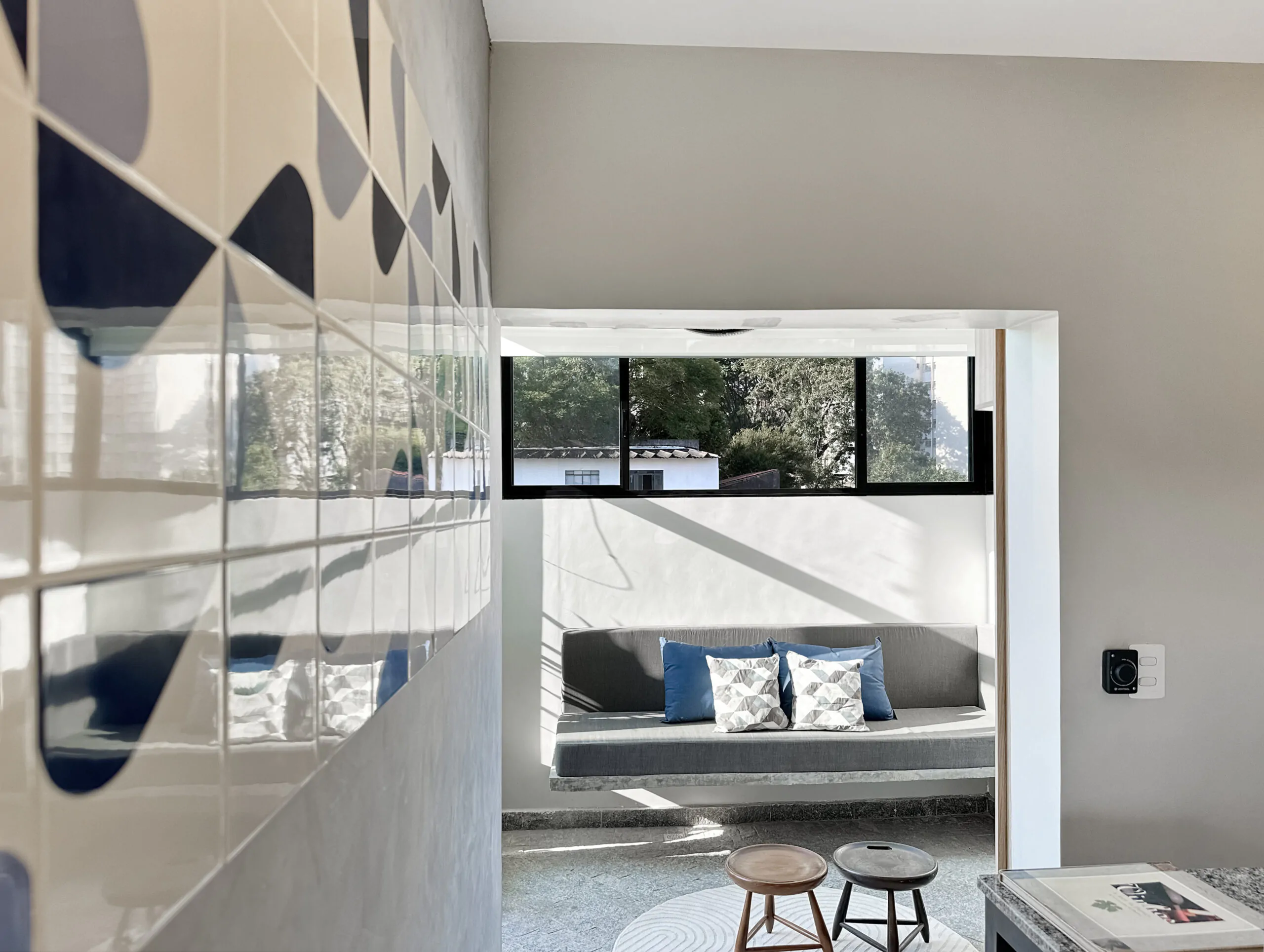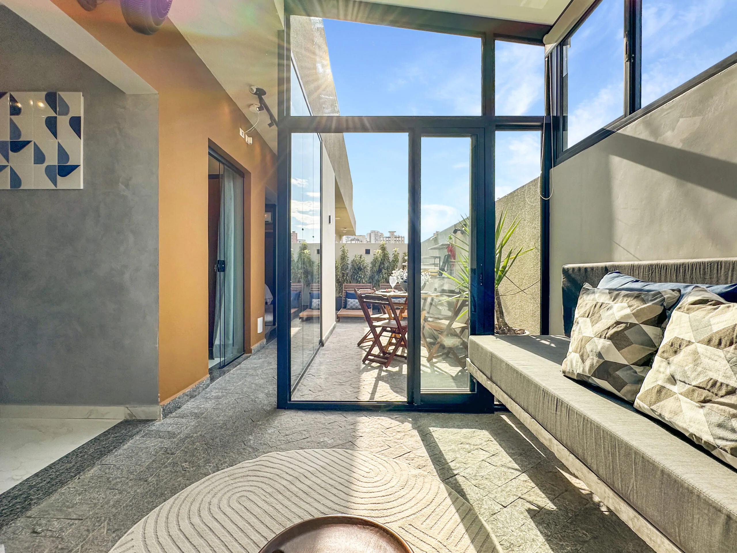 Originalmente concebido como um studio garden, este apartamento ganhou uma nova narrativa a partir do olhar estratégico para o Airbnb. Ao enxergar além da tipologia original, surgiu a ideia de transformar parte do garden em uma cobertura acolhedora, criando uma sala externa que amplia a experiência do morar — e do estar.