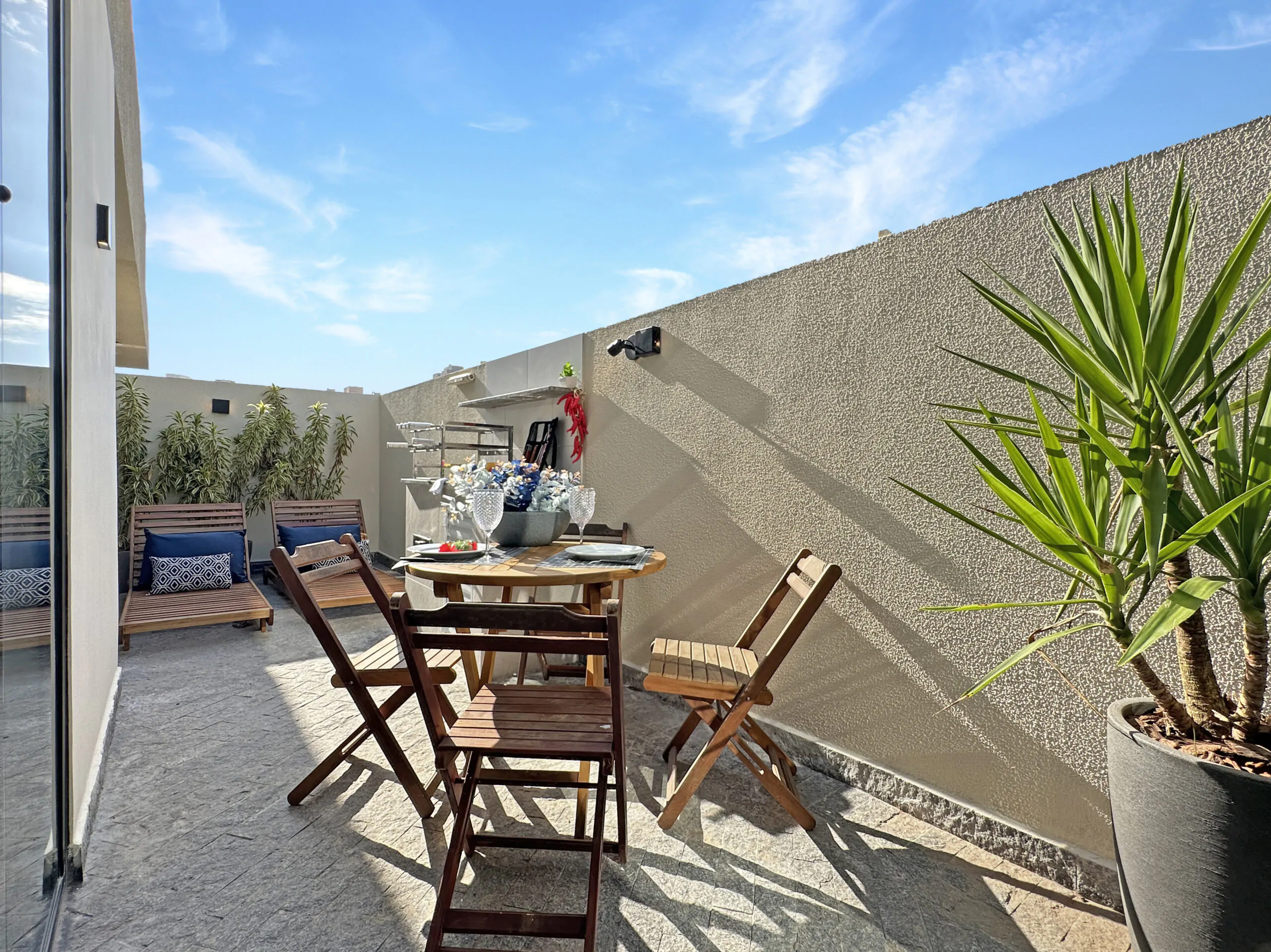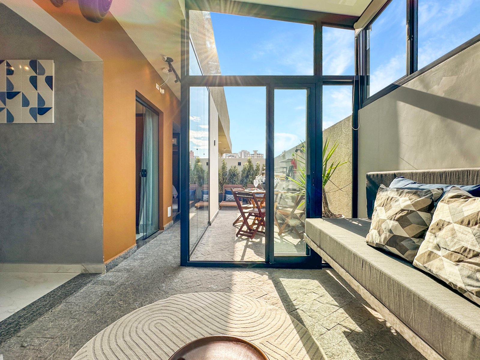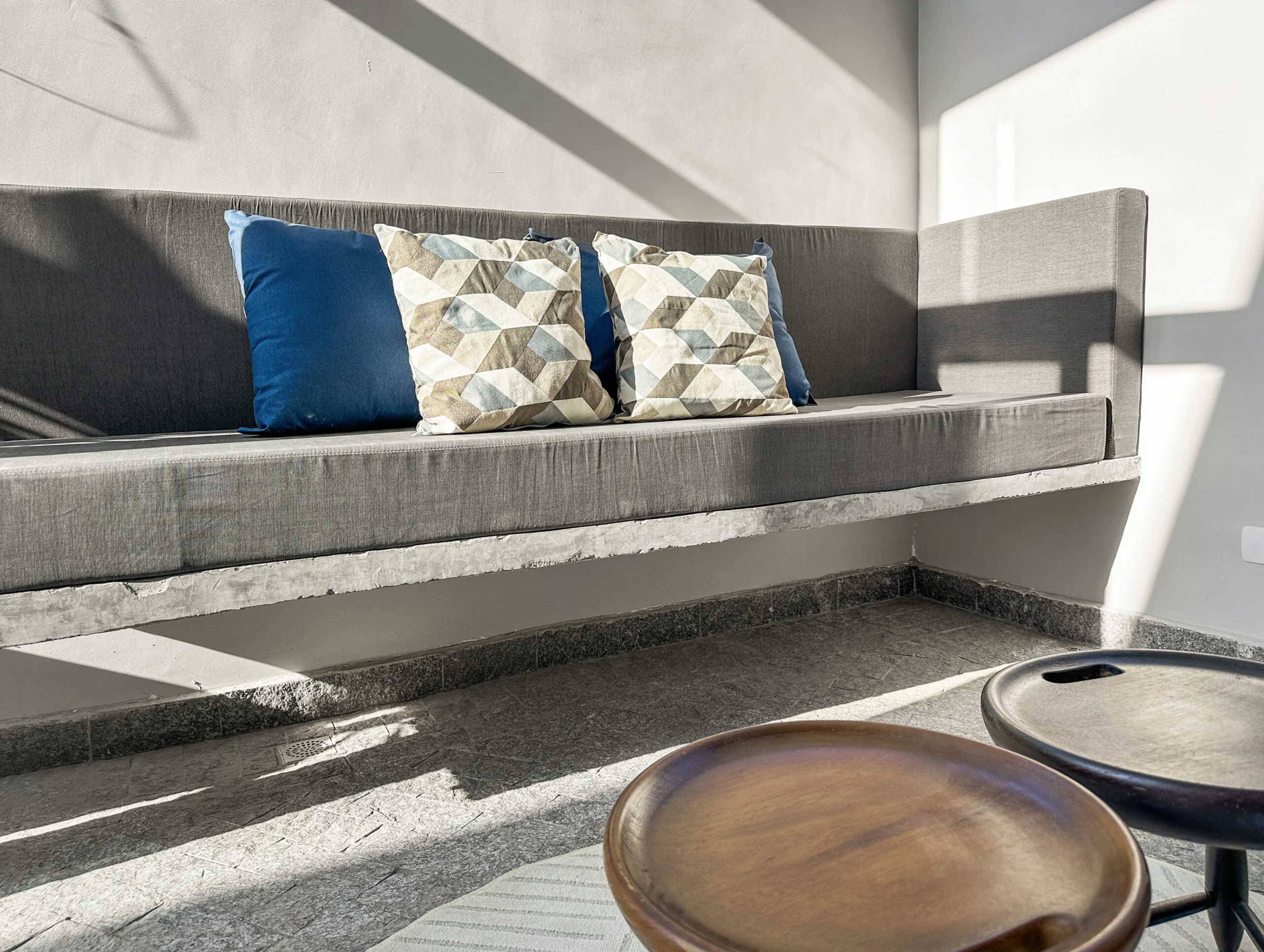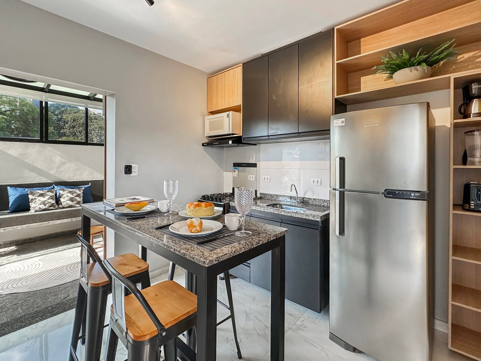 Originalmente concebido como um studio garden, este apartamento ganhou uma nova narrativa a partir do olhar estratégico para o Airbnb. Ao enxergar além da tipologia original, surgiu a ideia de transformar parte do garden em uma cobertura acolhedora, criando uma sala externa que amplia a experiência do morar — e do estar.