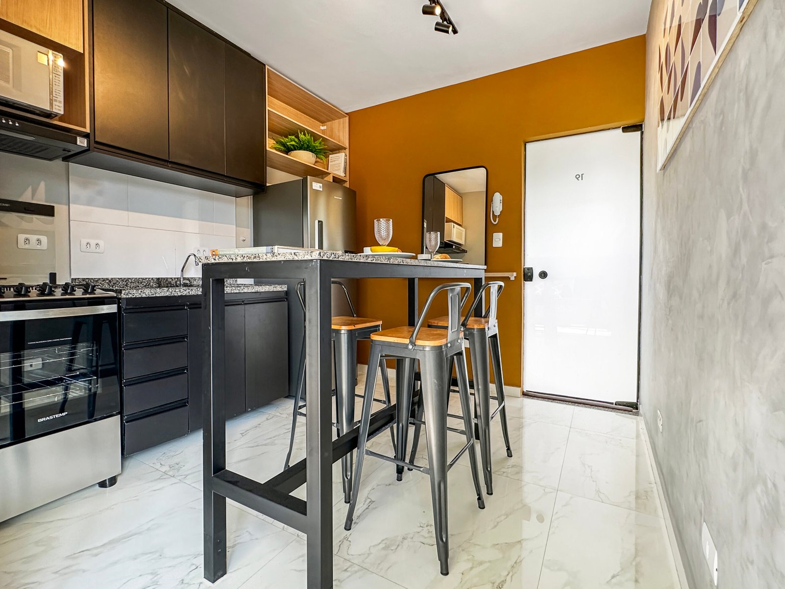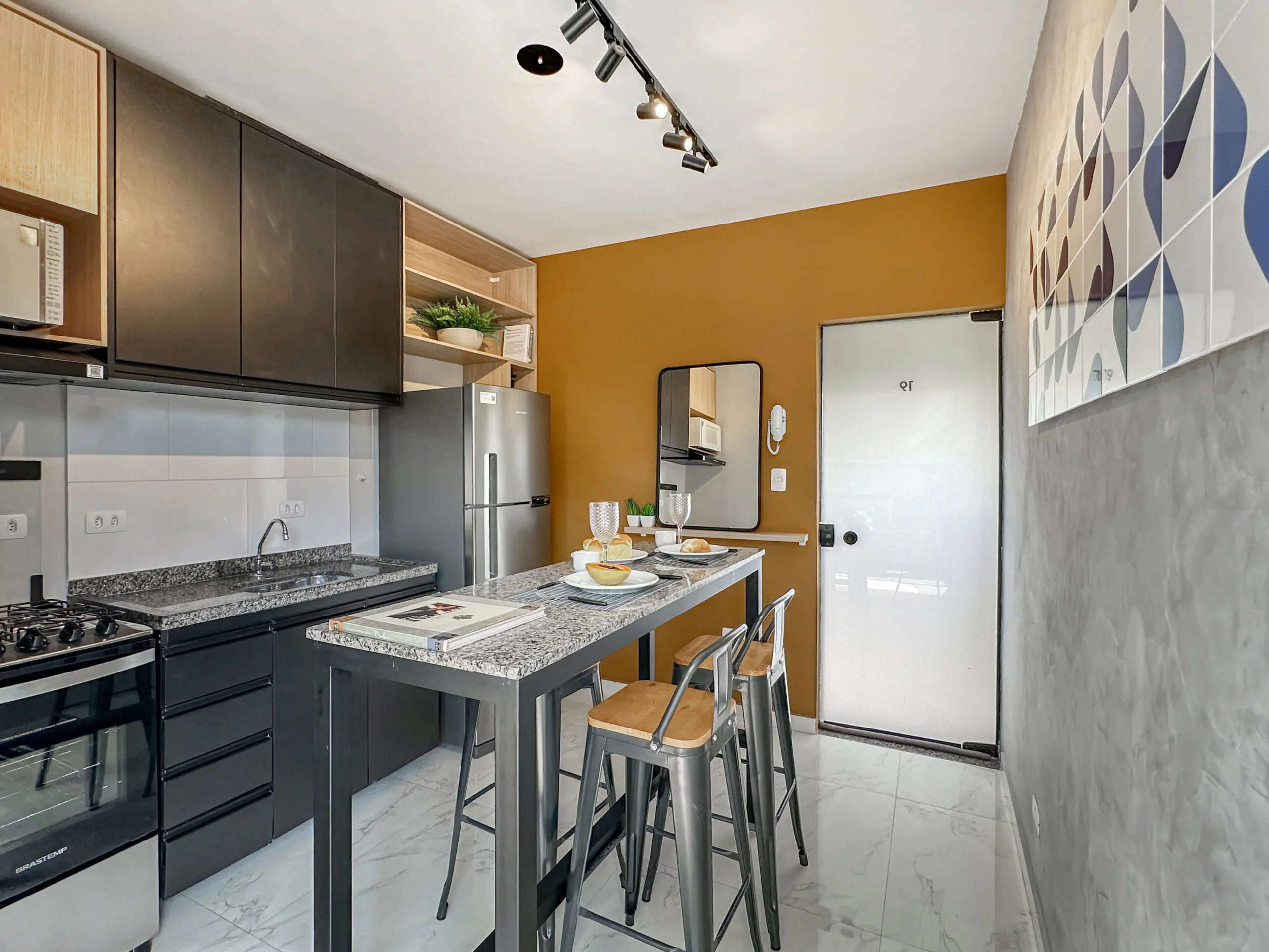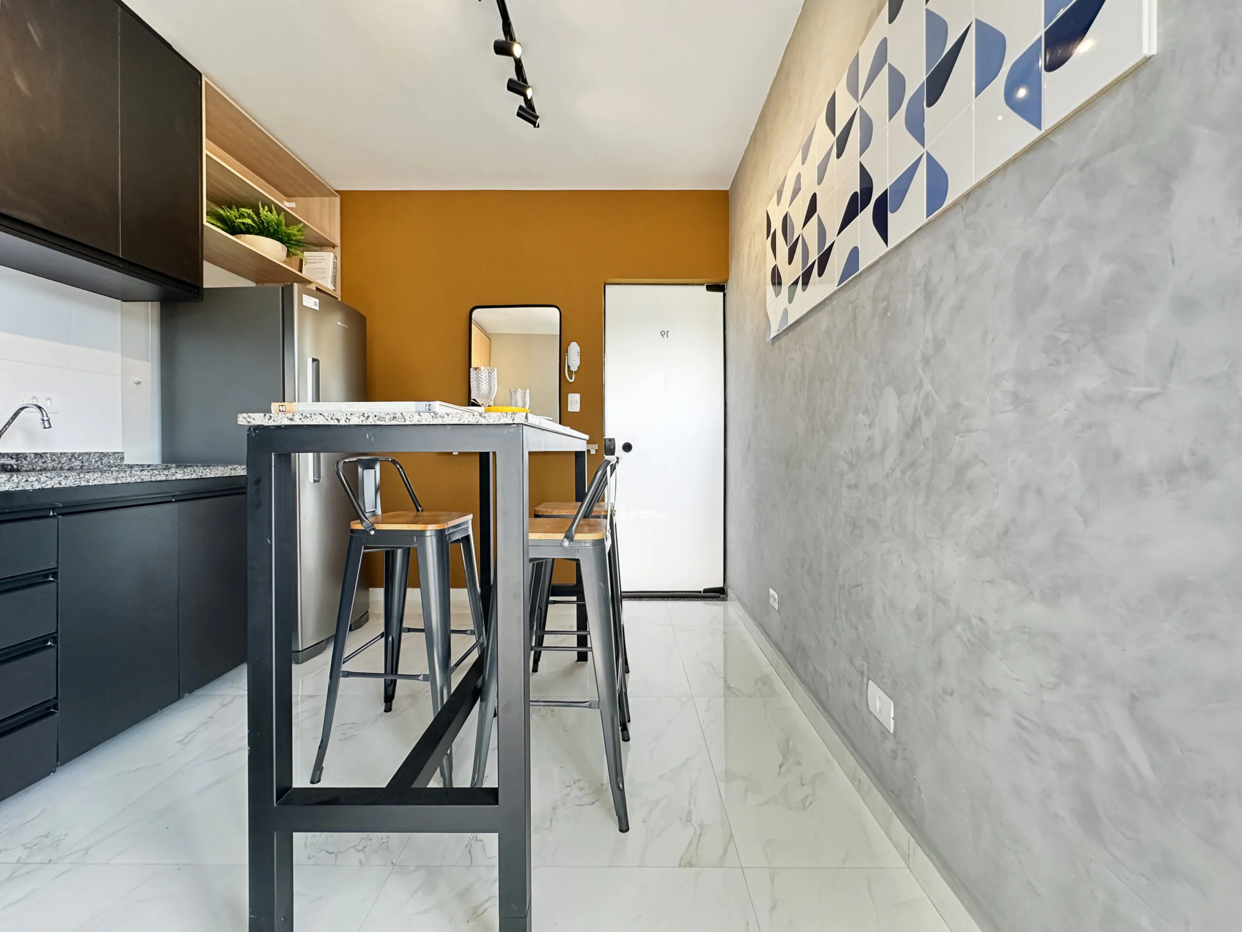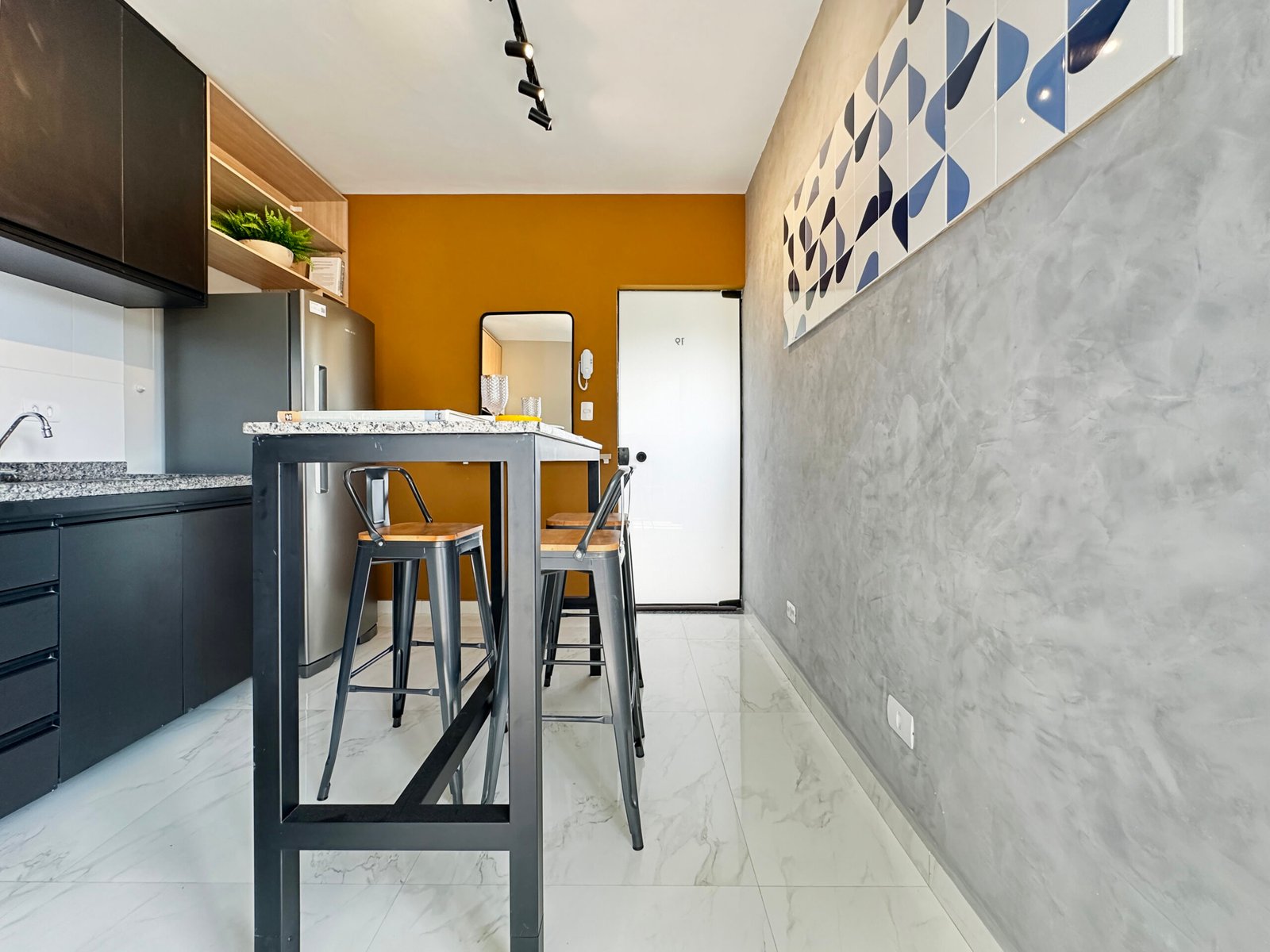 Apartamento projetado para Airbnb, com uso inteligente dos recursos para criar um espaço contemporâneo, funcional e com elementos urbanos marcantes.