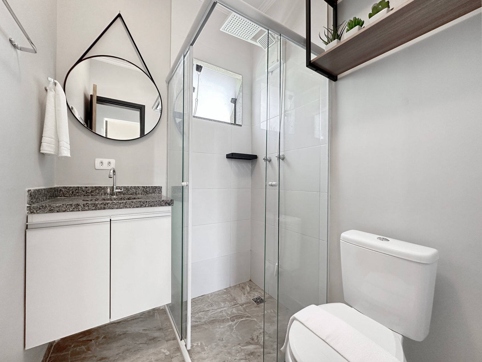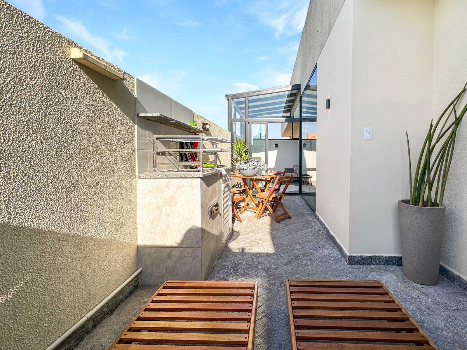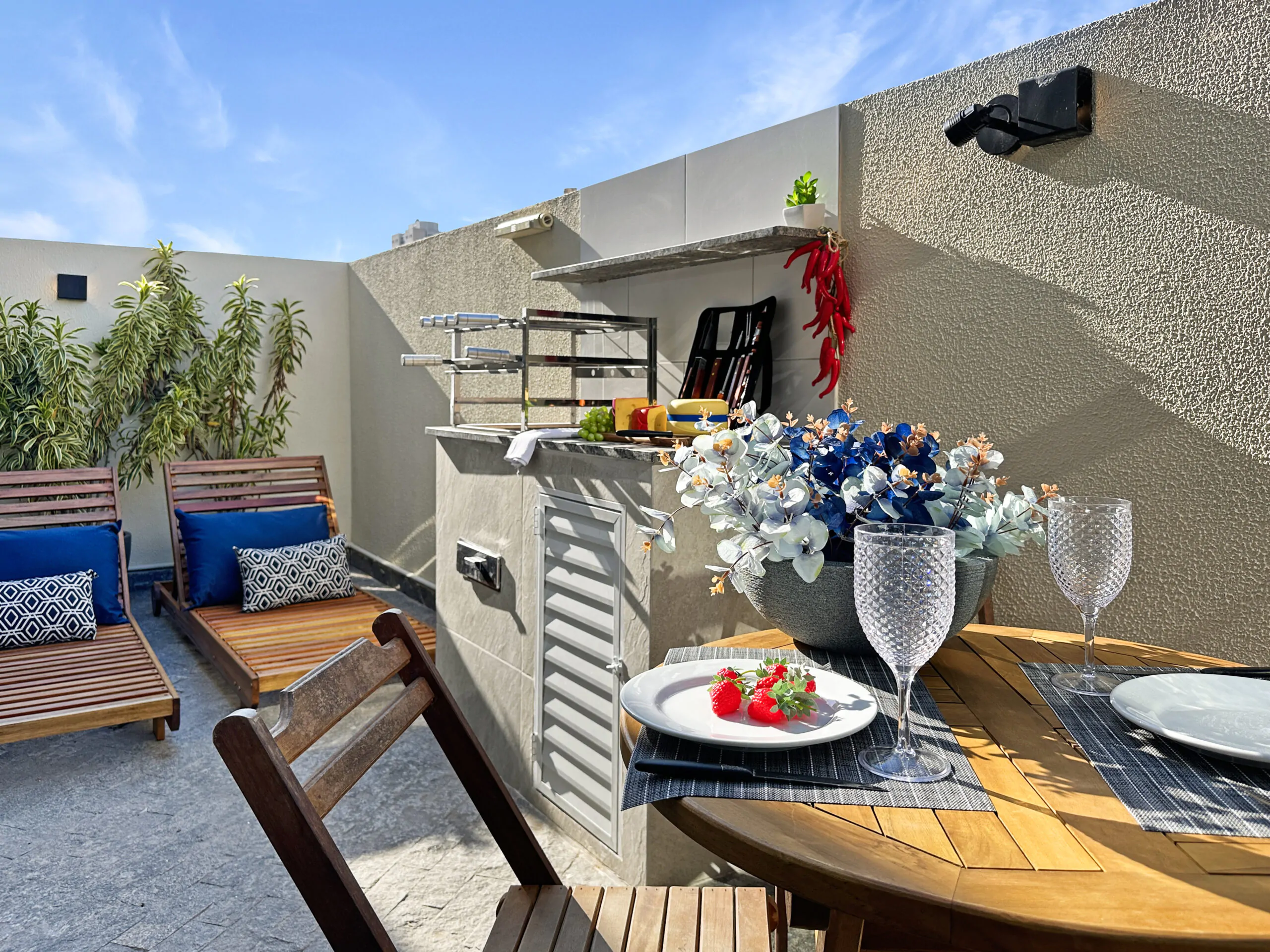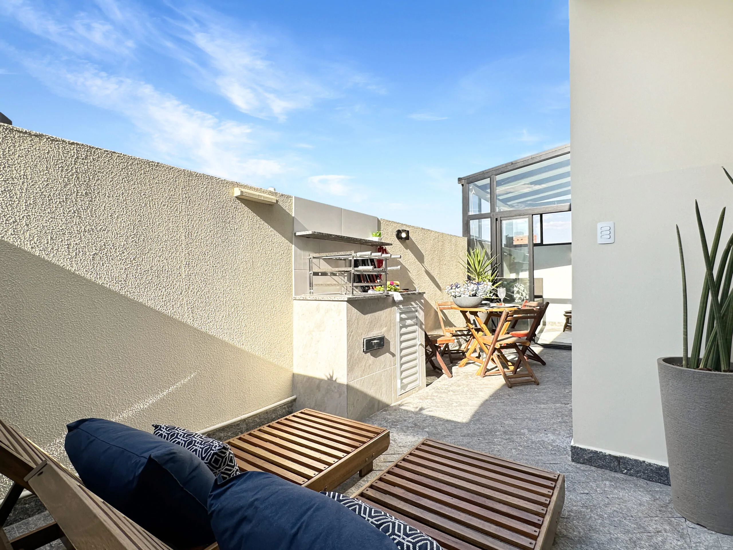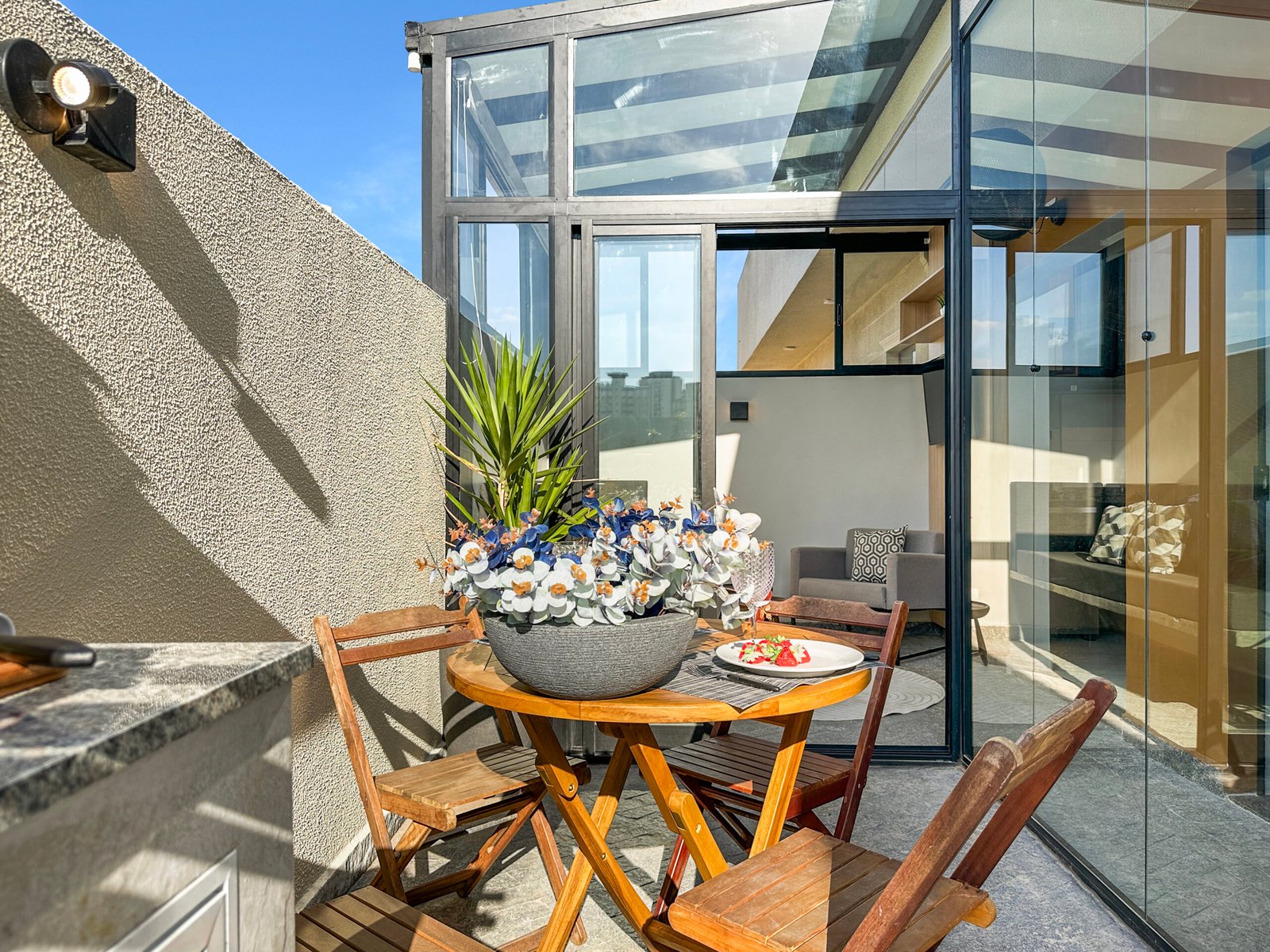 Todo o apartamento foi desenhado como um refúgio contemporâneo, onde materiais atuais e uma paleta de cores marcante criam atmosferas acolhedoras e cheias de identidade. Já na área externa, o projeto convida à pausa: um espaço para banho de sol, encontros despretensiosos e uma churrasqueira com mesa de apoio que transforma o garden em cenário de convivência.