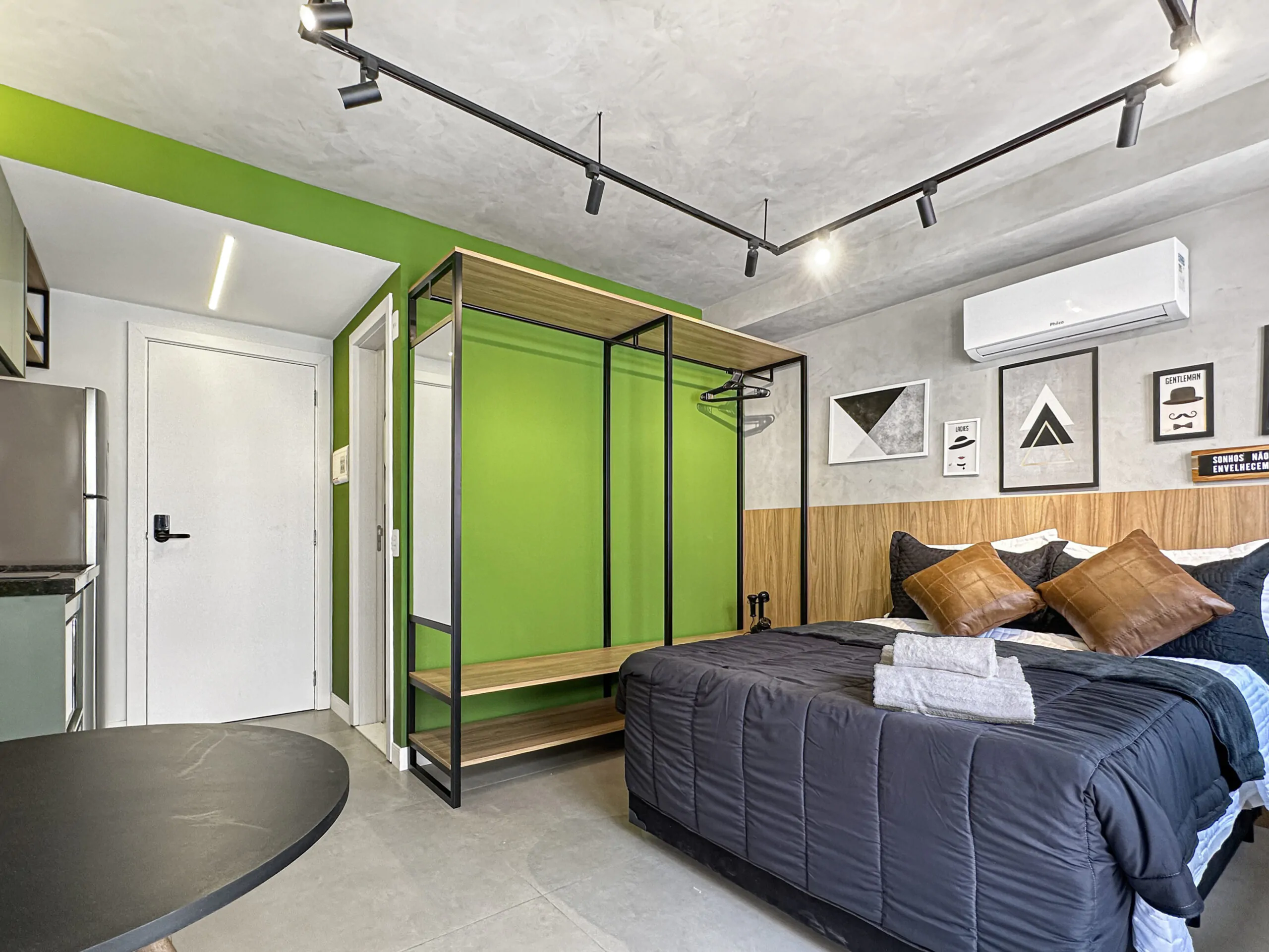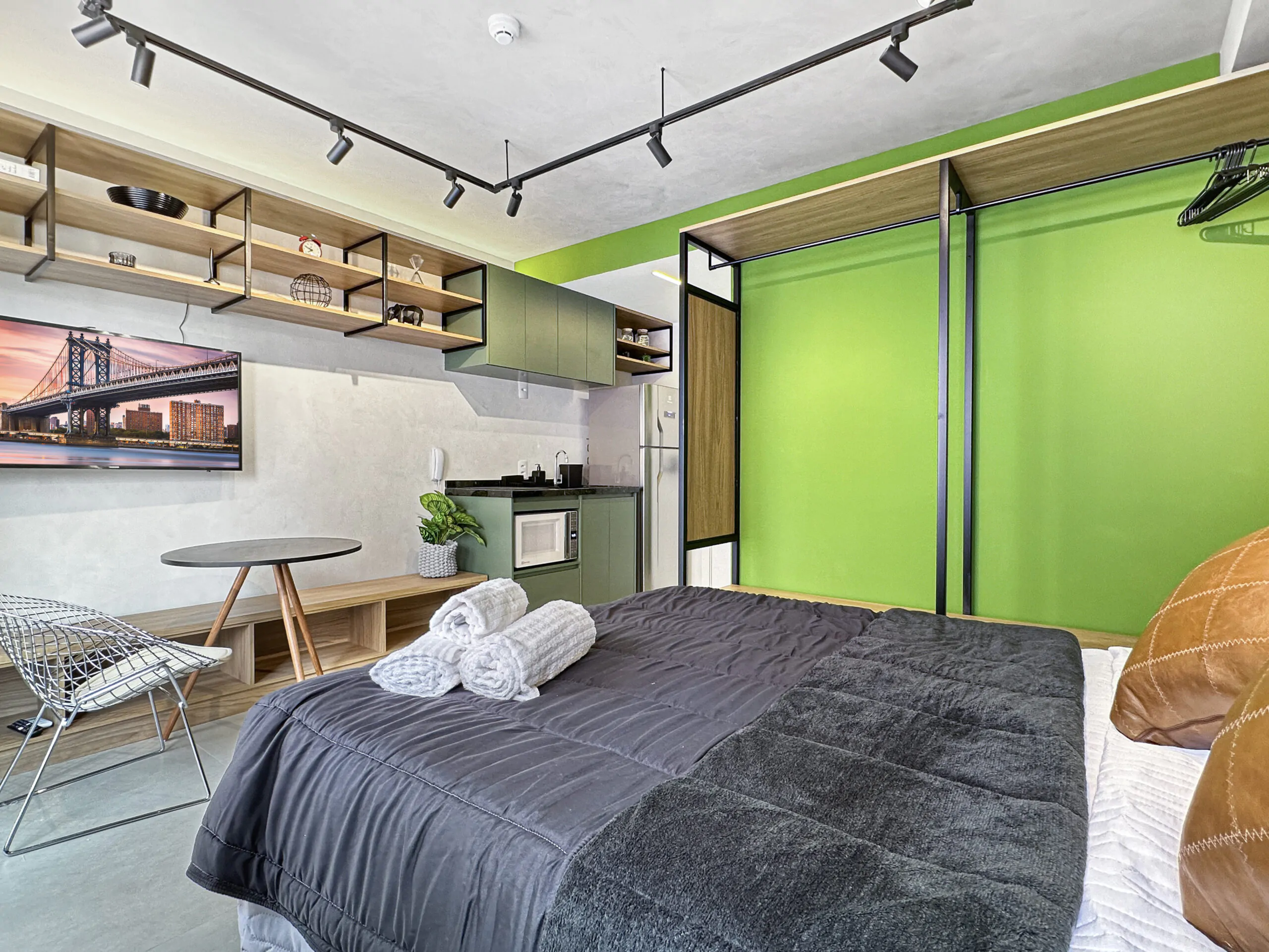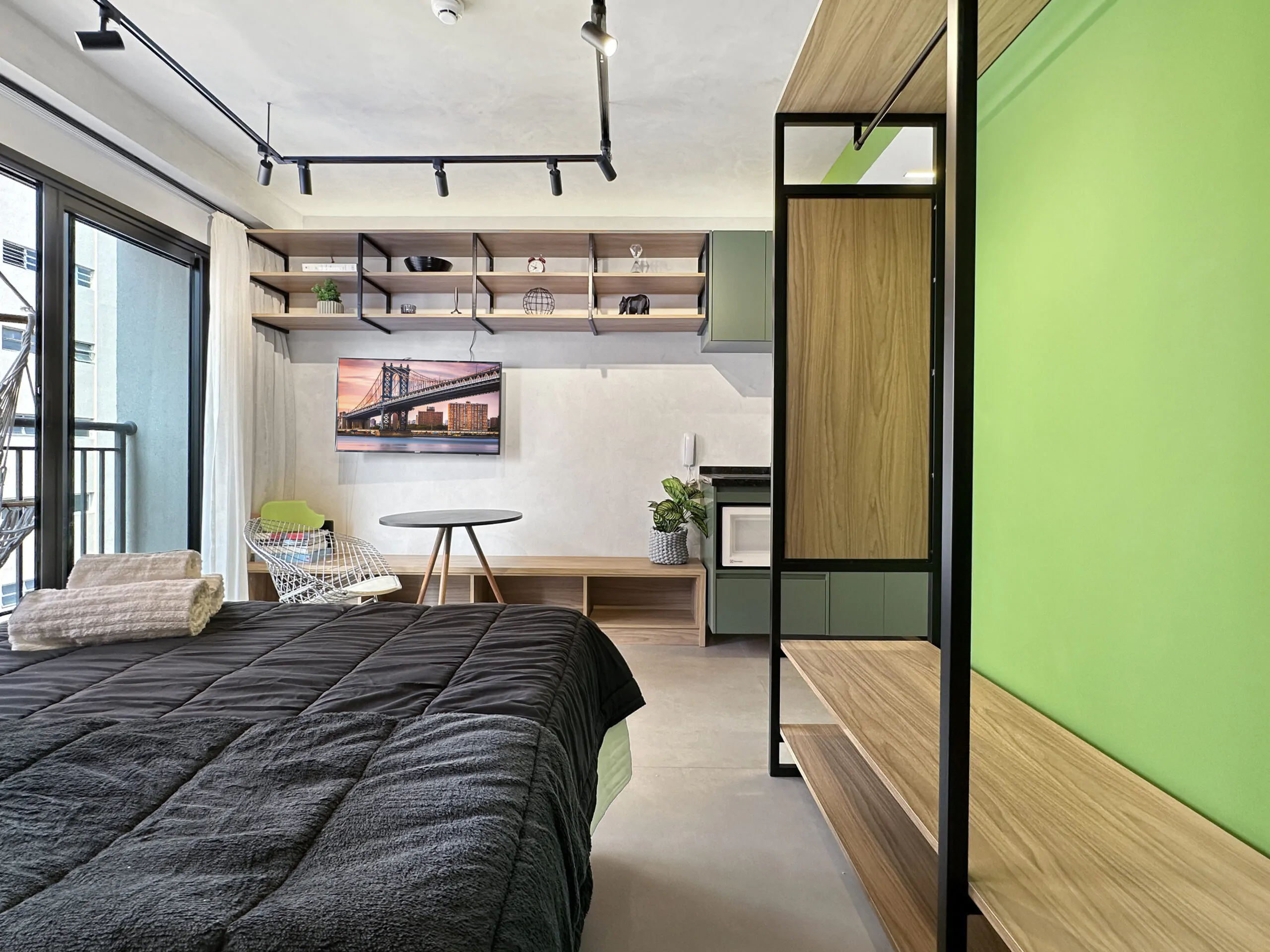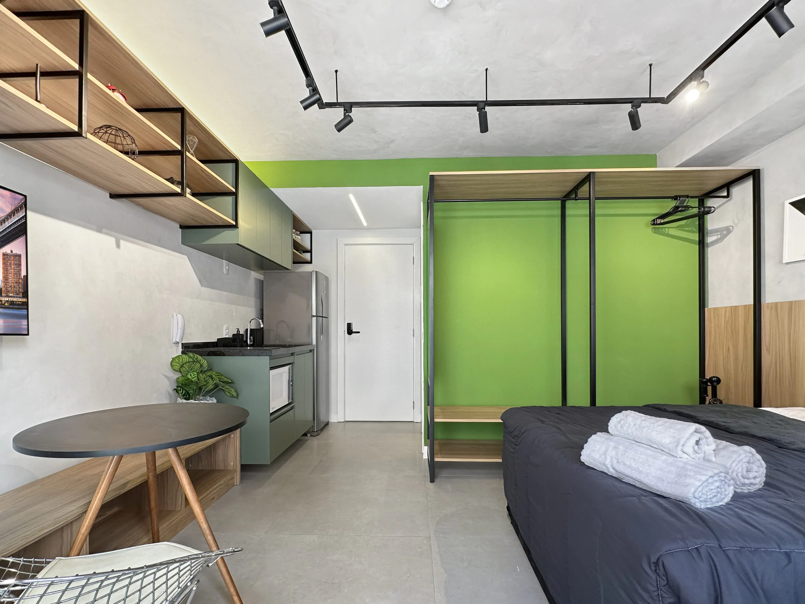 Este studio foi pensado a partir da ideia de performance: um espaço compacto, mas eficiente, onde cada escolha de projeto responde tanto à estética quanto ao uso diário. A linguagem moderna se constrói no contraste entre superfícies brancas e cinzas e a presença marcante do verde, que aparece em paredes, armários e revestimentos, trazendo frescor e personalidade ao ambiente.