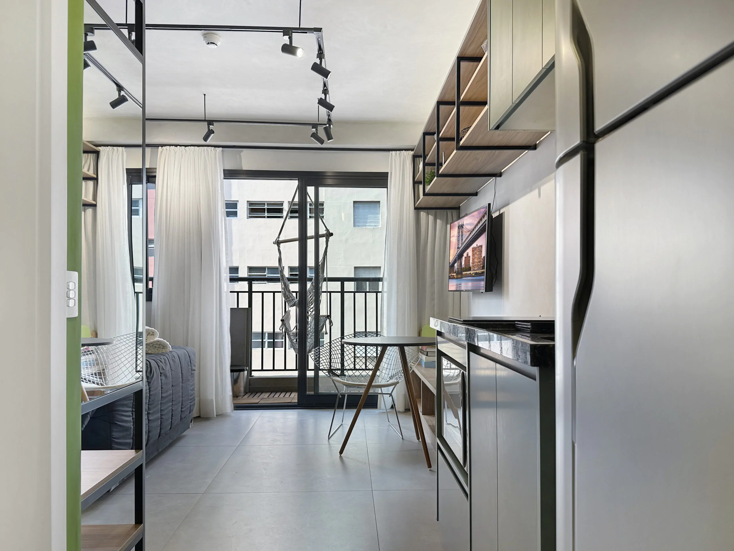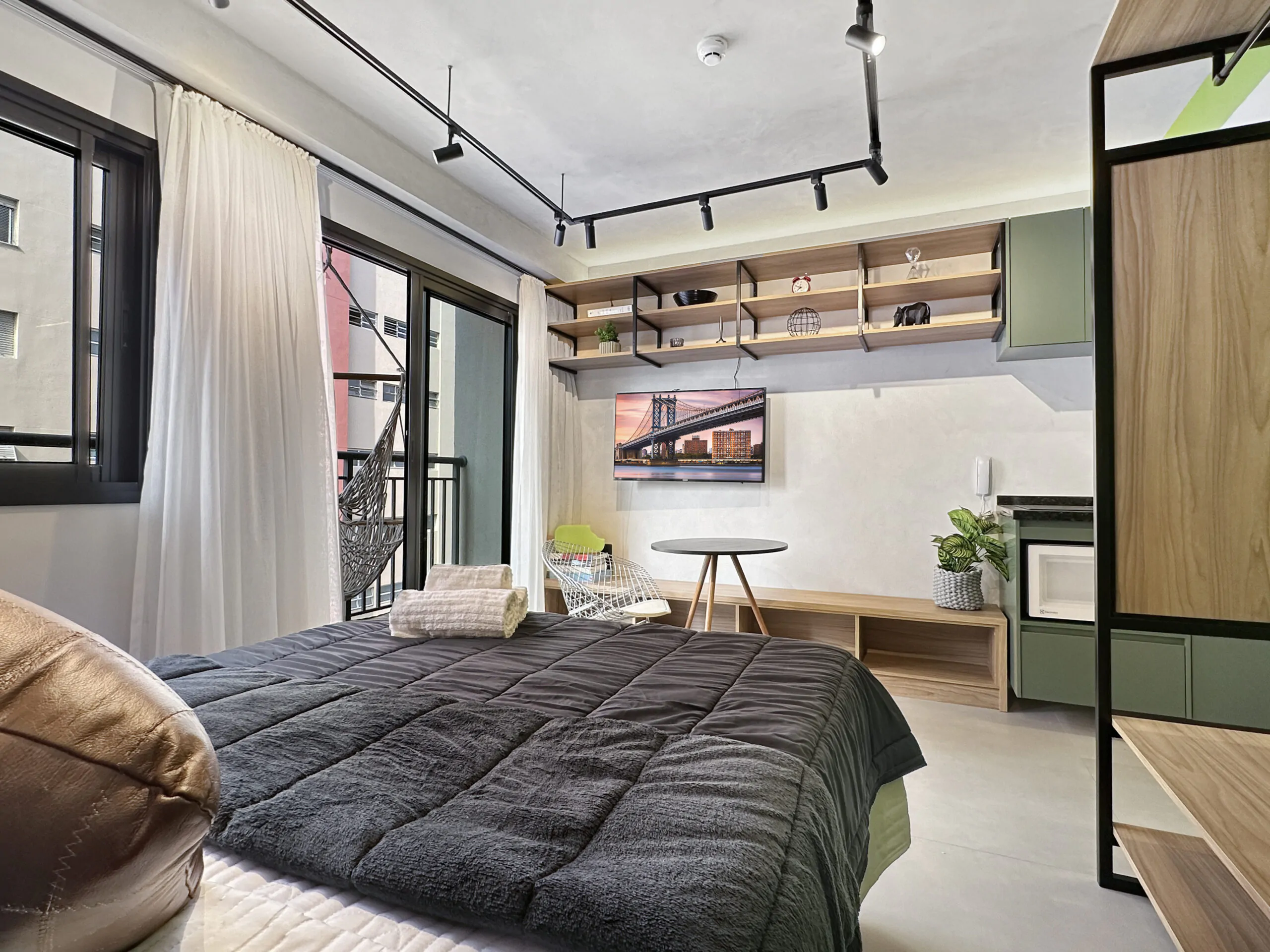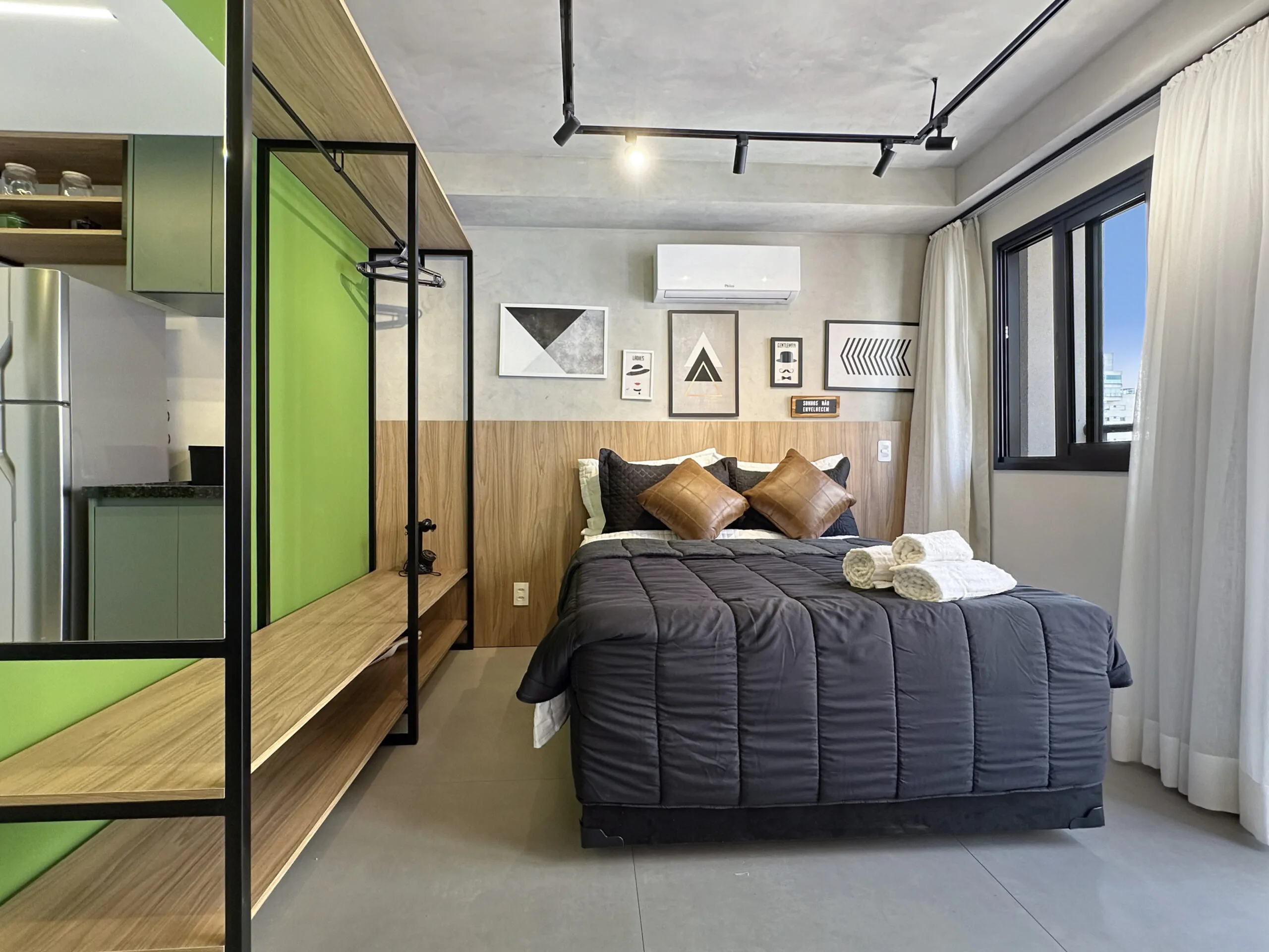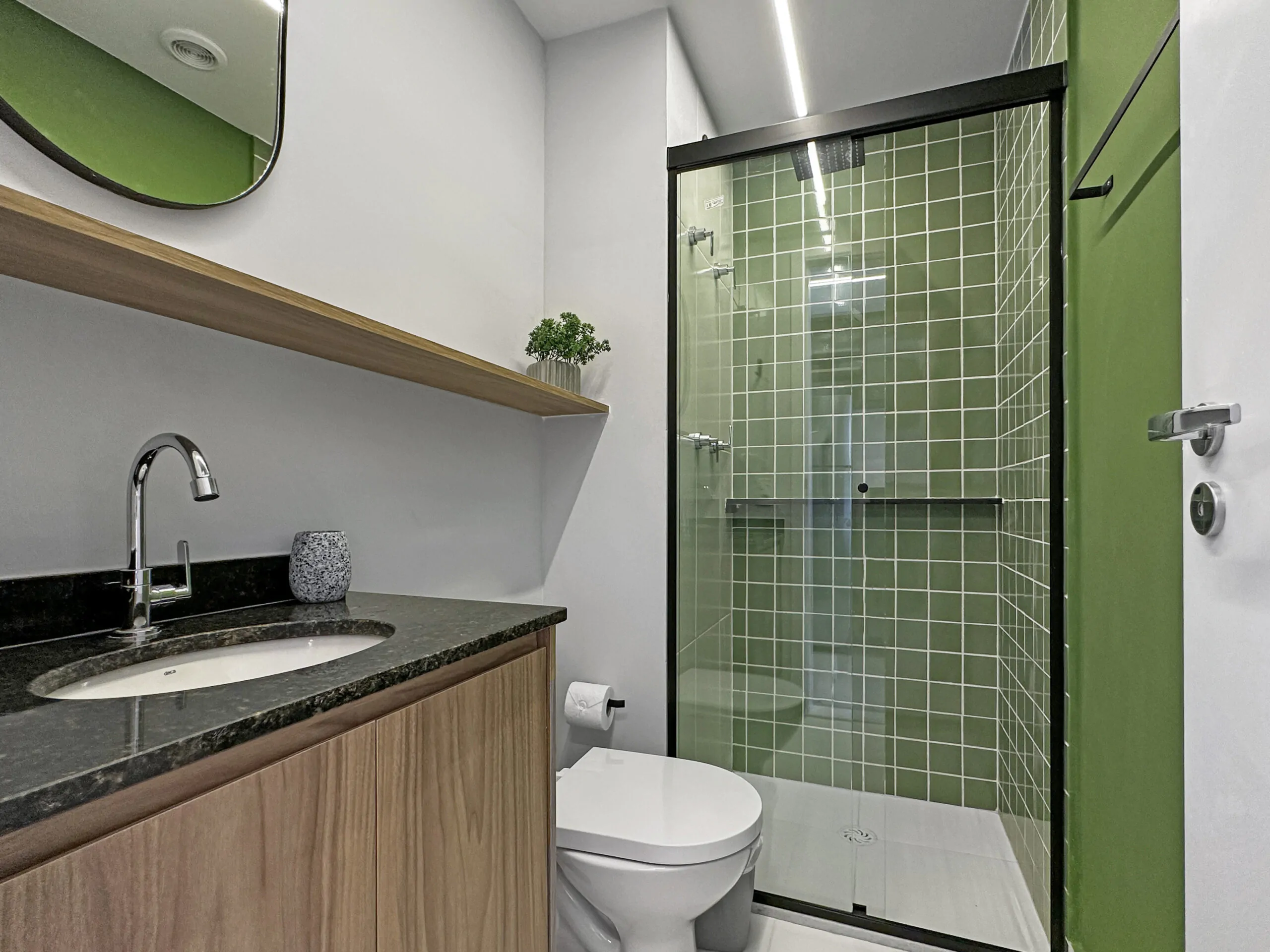 Este studio foi pensado a partir da ideia de performance: um espaço compacto, mas eficiente, onde cada escolha de projeto responde tanto à estética quanto ao uso diário. A linguagem moderna se constrói no contraste entre superfícies brancas e cinzas e a presença marcante do verde, que aparece em paredes, armários e revestimentos, trazendo frescor e personalidade ao ambiente.