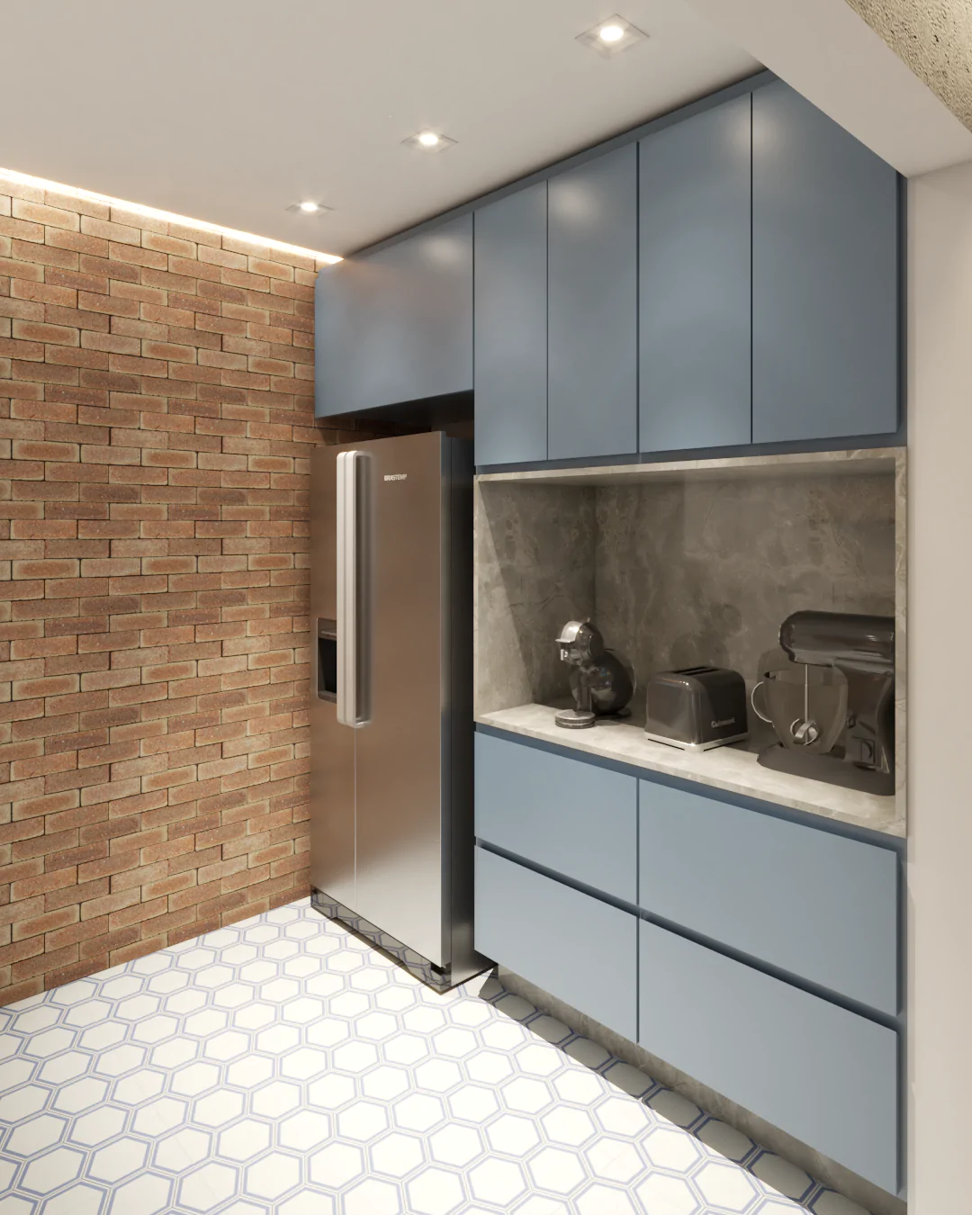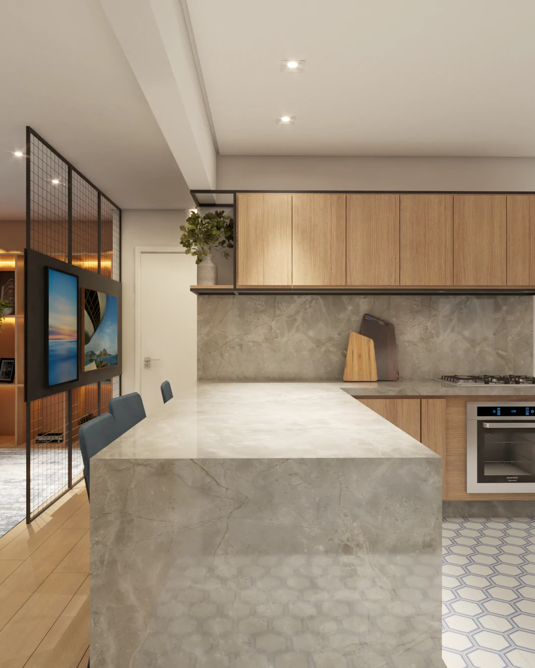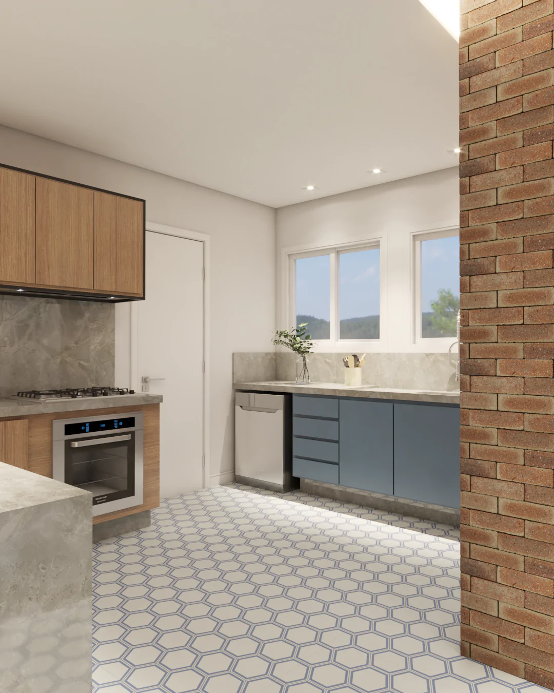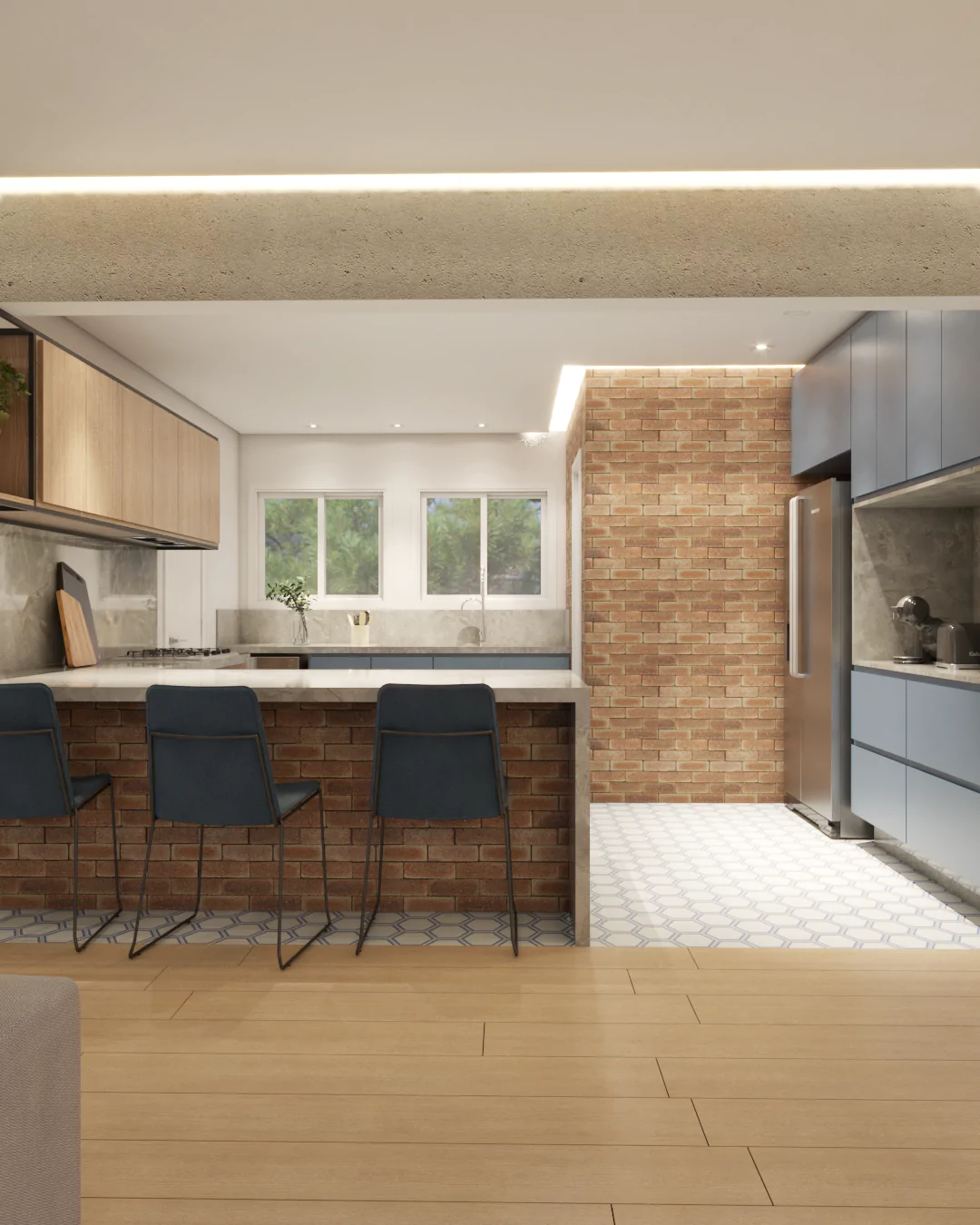 Os detalhes carregam memória e afeto. Na cozinha, o ladrilho hidráulico foi escolhido por remeter ao desenho presente na casa da avó da cliente, onde ela foi criada, trazendo para o projeto uma camada emocional que vai além da estética.