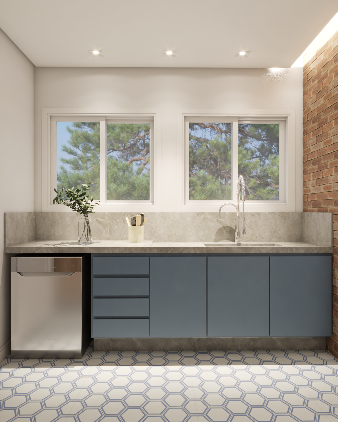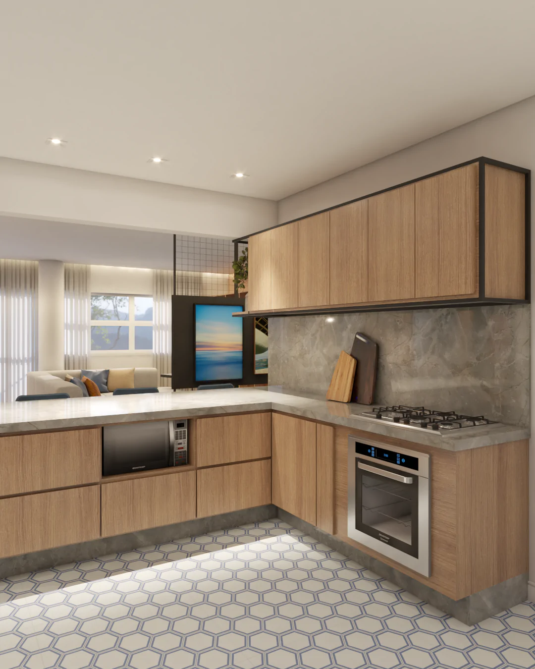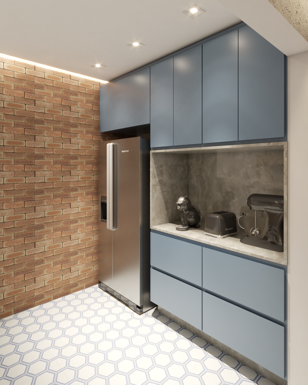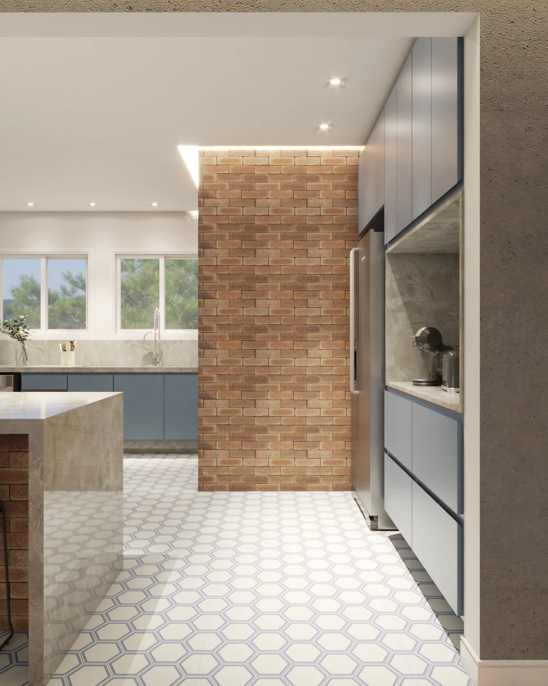 Os detalhes carregam memória e afeto. Na cozinha, o ladrilho hidráulico foi escolhido por remeter ao desenho presente na casa da avó da cliente, onde ela foi criada, trazendo para o projeto uma camada emocional que vai além da estética.