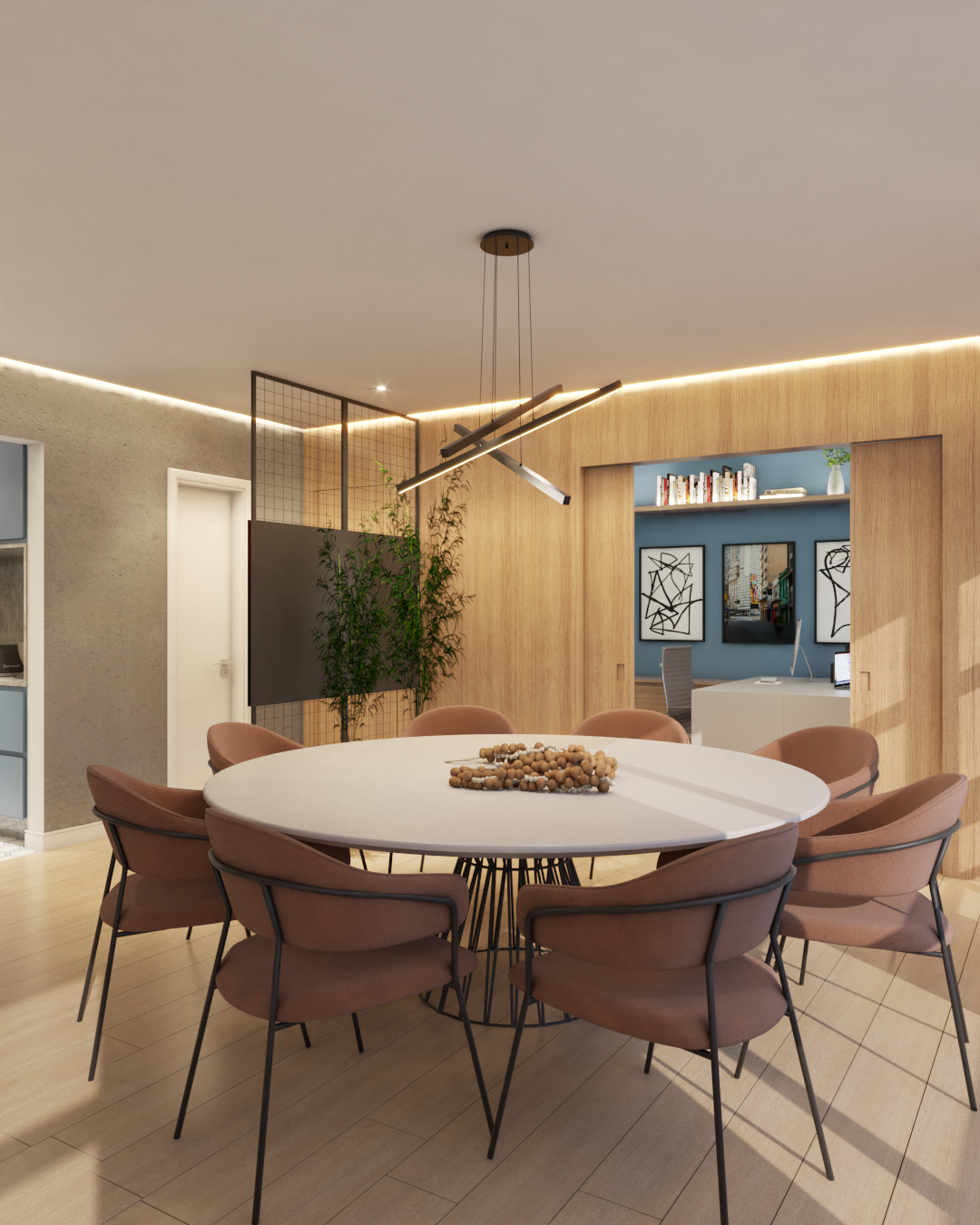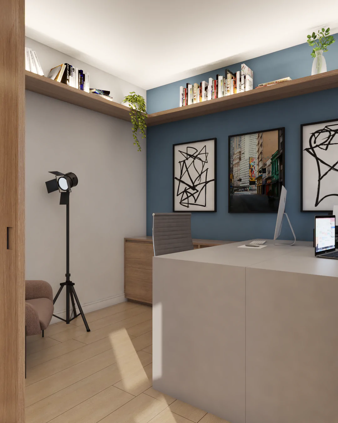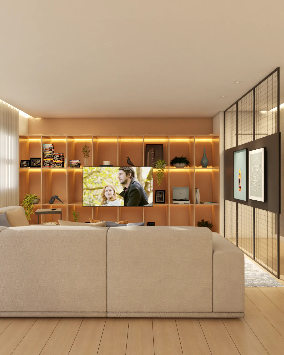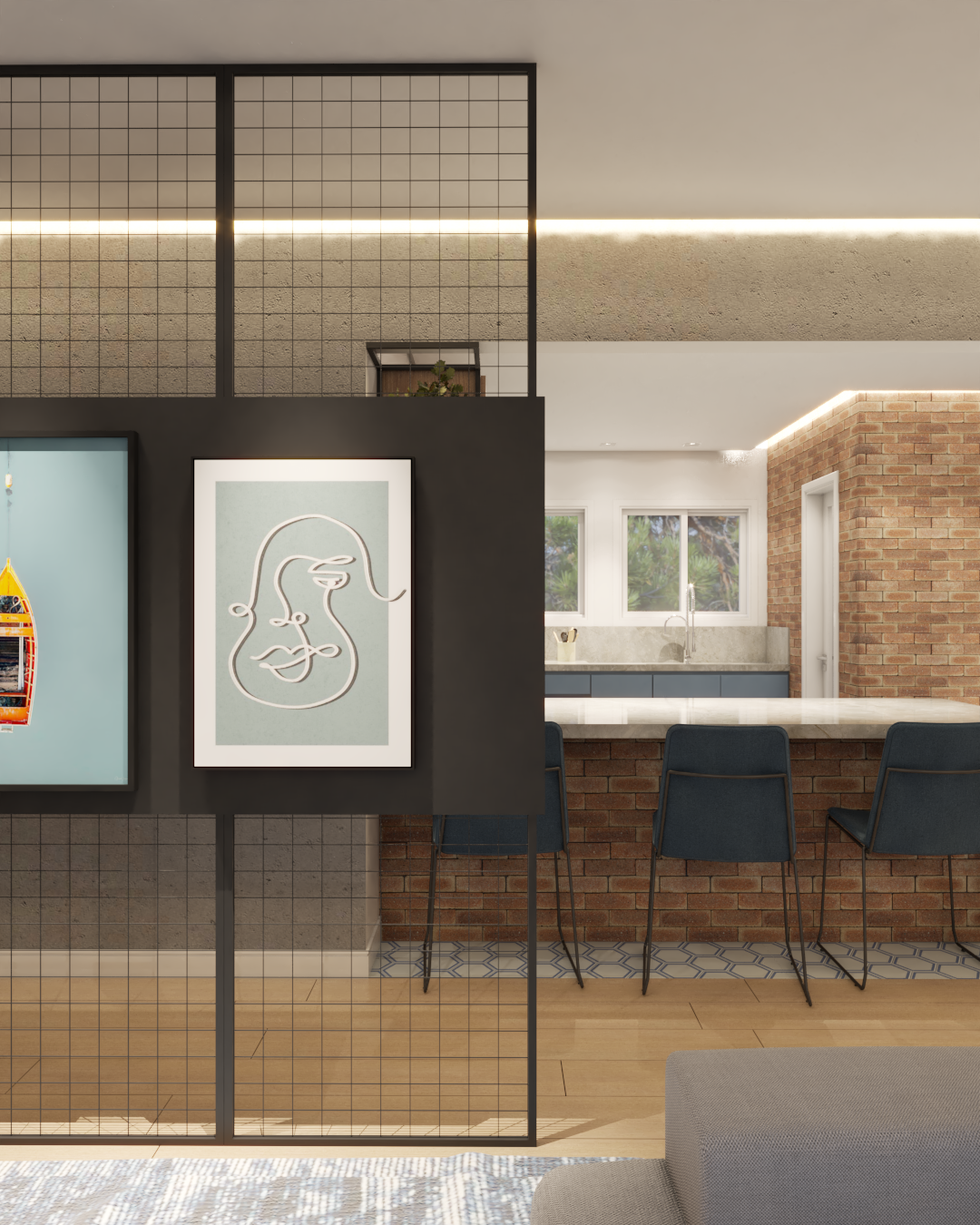 O apartamento também assume o papel de galeria. Estruturas metálicas foram incorporadas para apoiar obras de arte, que não apenas ocupam as paredes, mas também orientam a paleta de cores e a identidade visual dos ambientes. O urbano se manifesta tanto nas artes quanto na materialidade, criando uma narrativa coerente e cheia de personalidade.