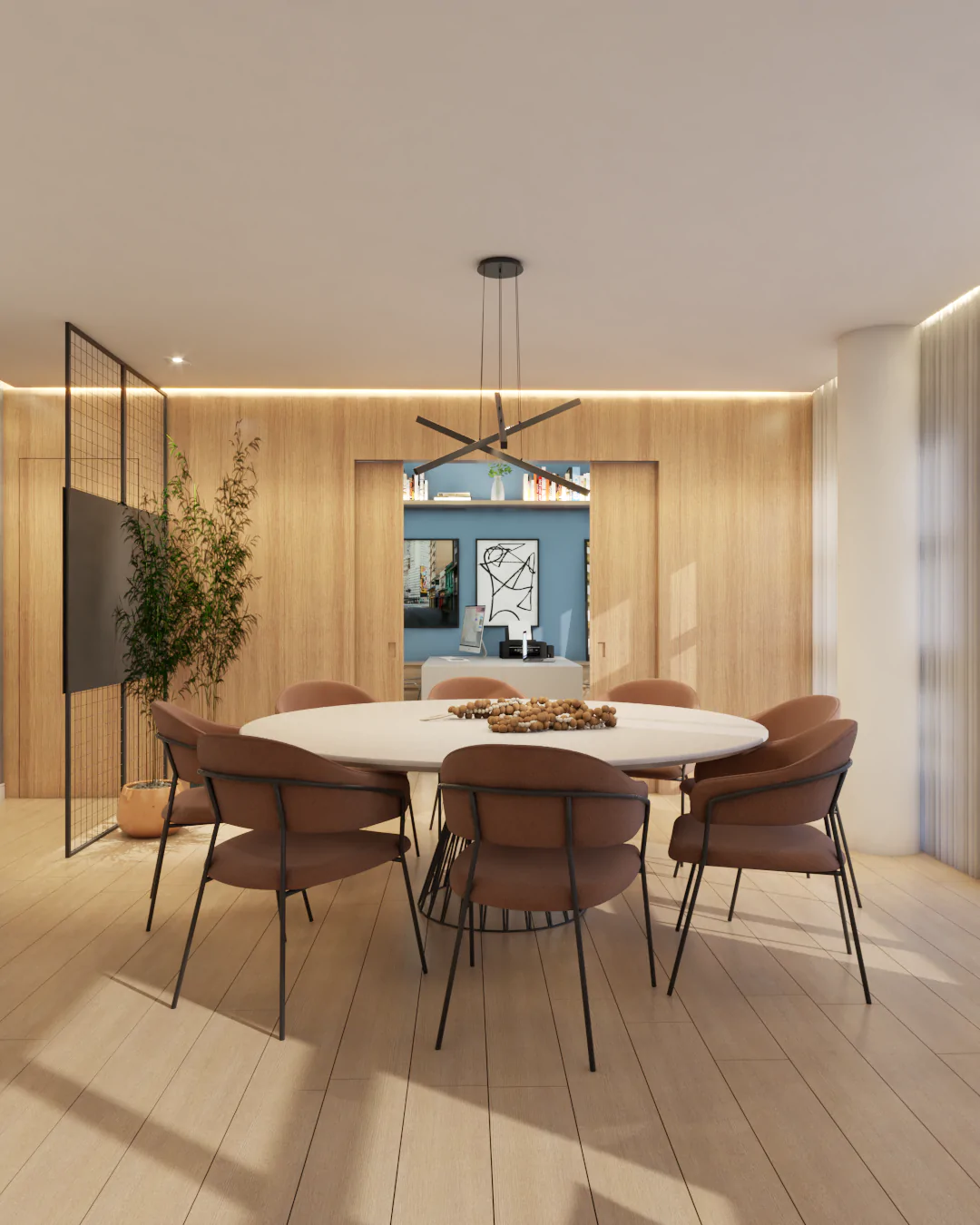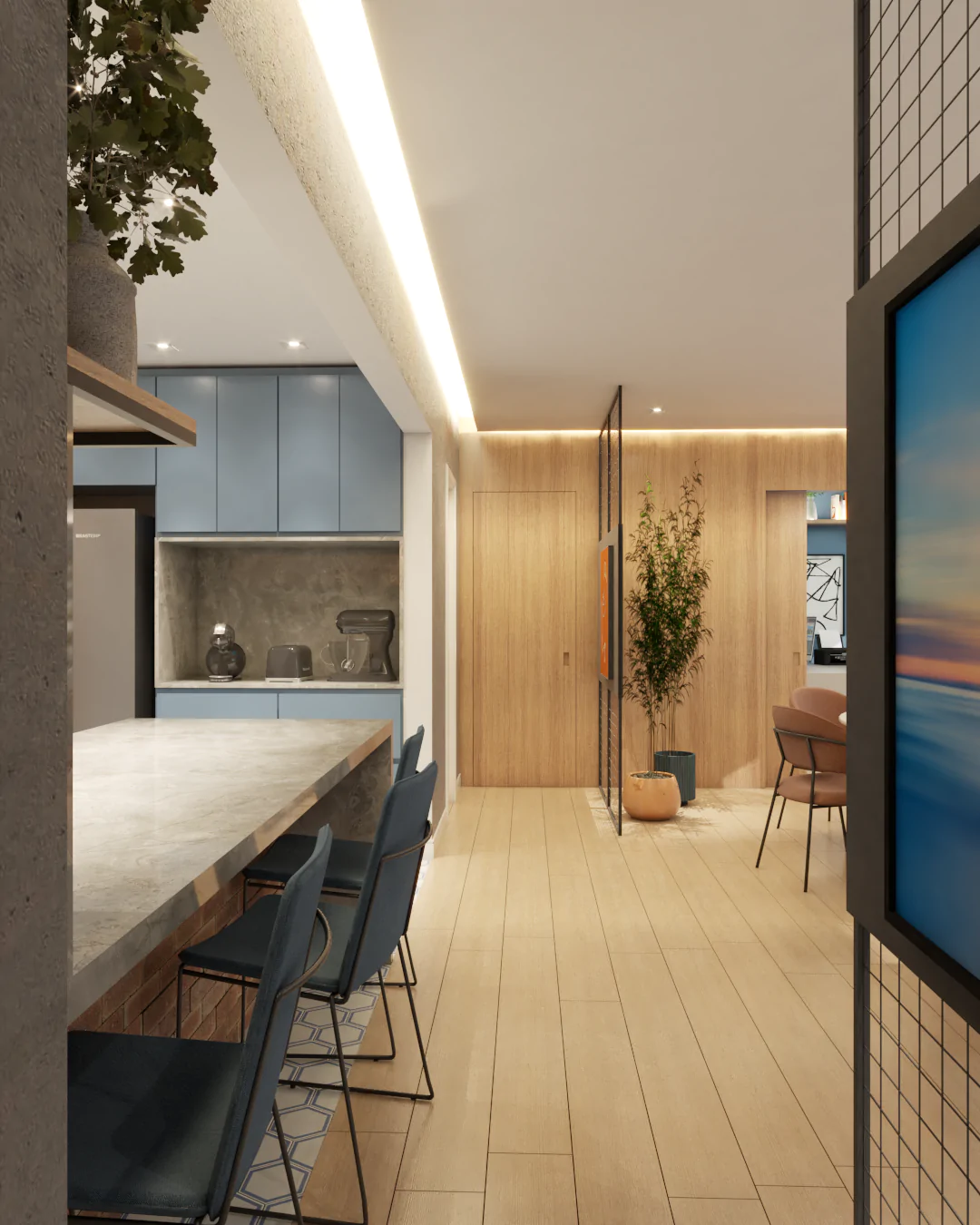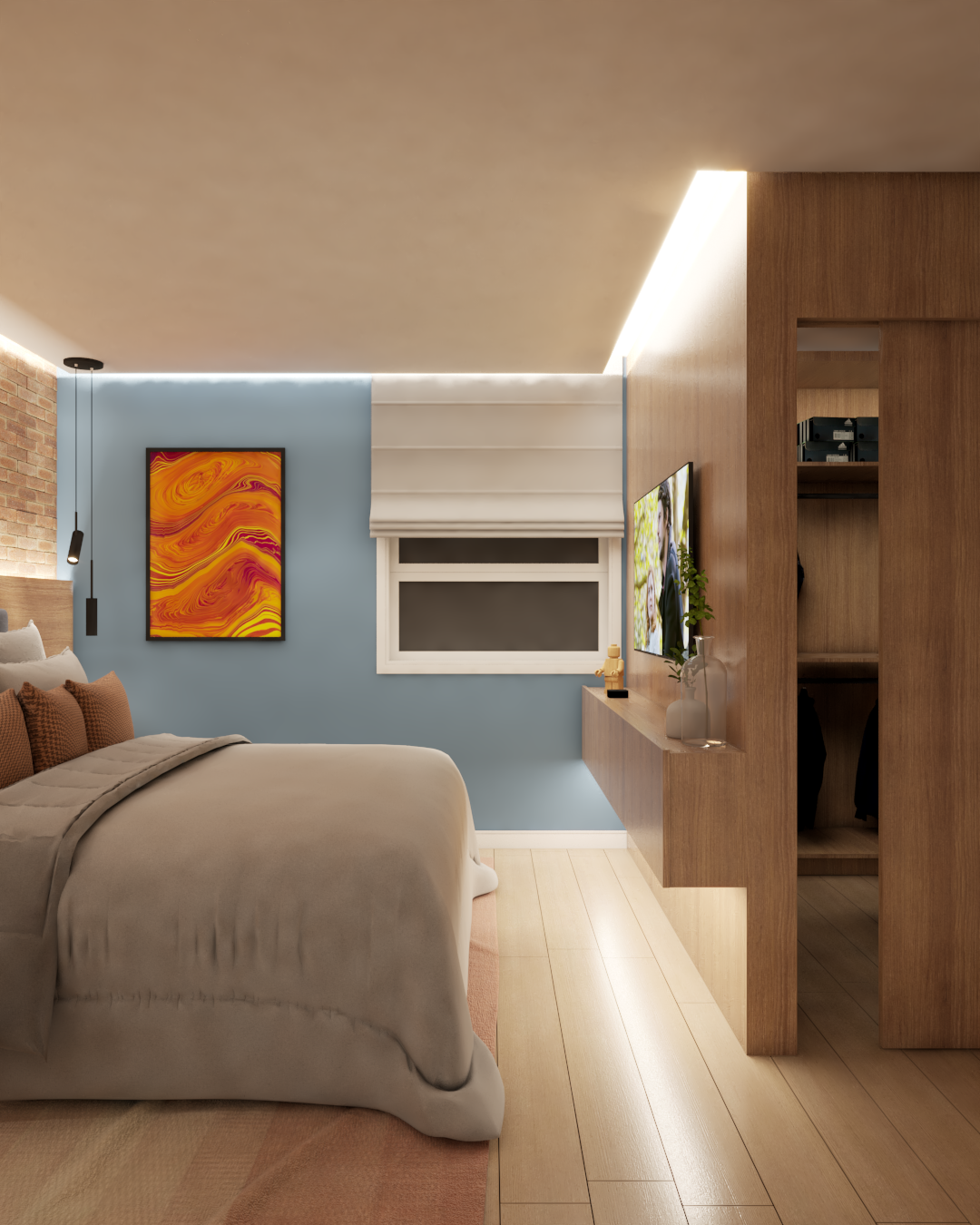 O apartamento também assume o papel de galeria. Estruturas metálicas foram incorporadas para apoiar obras de arte, que não apenas ocupam as paredes, mas também orientam a paleta de cores e a identidade visual dos ambientes. O urbano se manifesta tanto nas artes quanto na materialidade, criando uma narrativa coerente e cheia de personalidade.