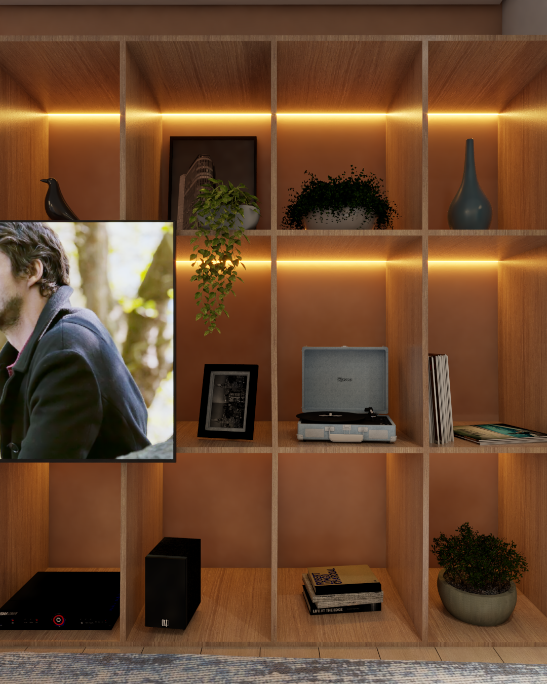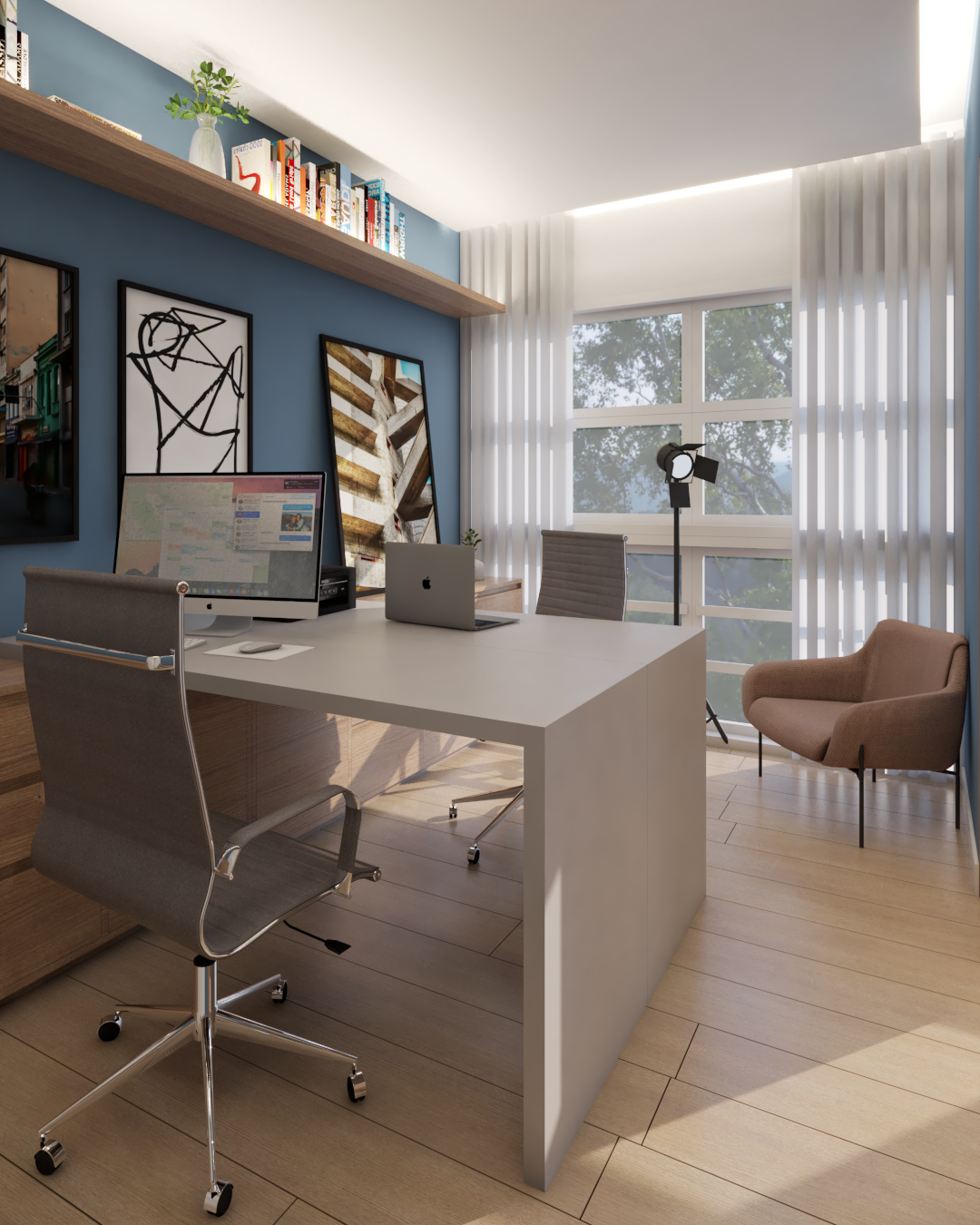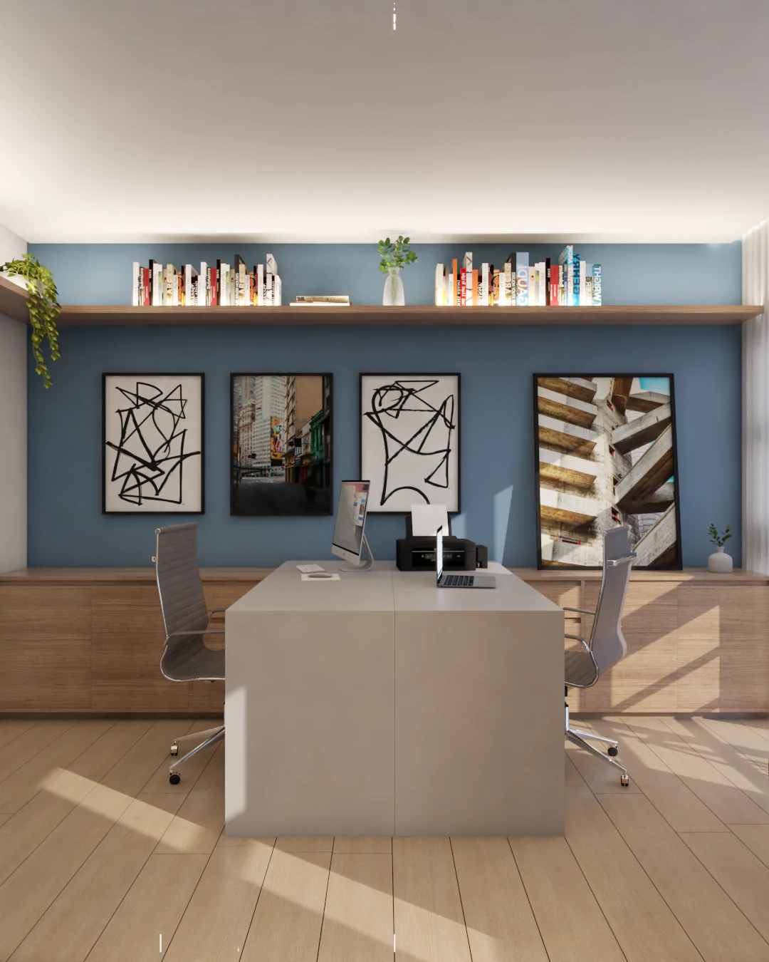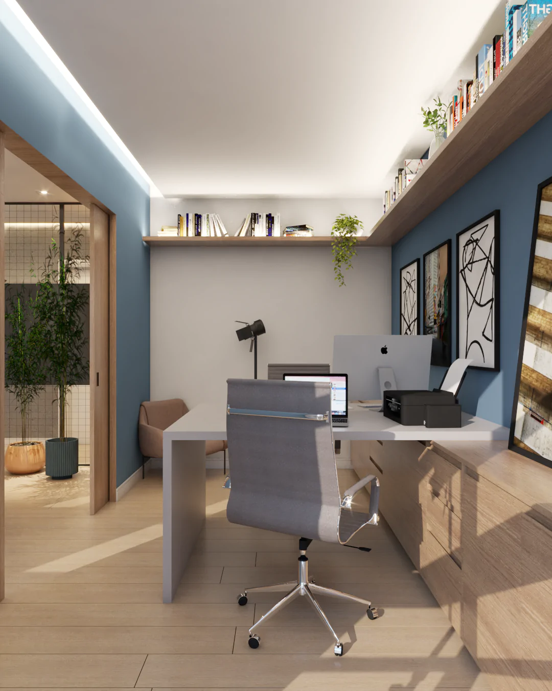 O apartamento também assume o papel de galeria. Estruturas metálicas foram incorporadas para apoiar obras de arte, que não apenas ocupam as paredes, mas também orientam a paleta de cores e a identidade visual dos ambientes. O urbano se manifesta tanto nas artes quanto na materialidade, criando uma narrativa coerente e cheia de personalidade.