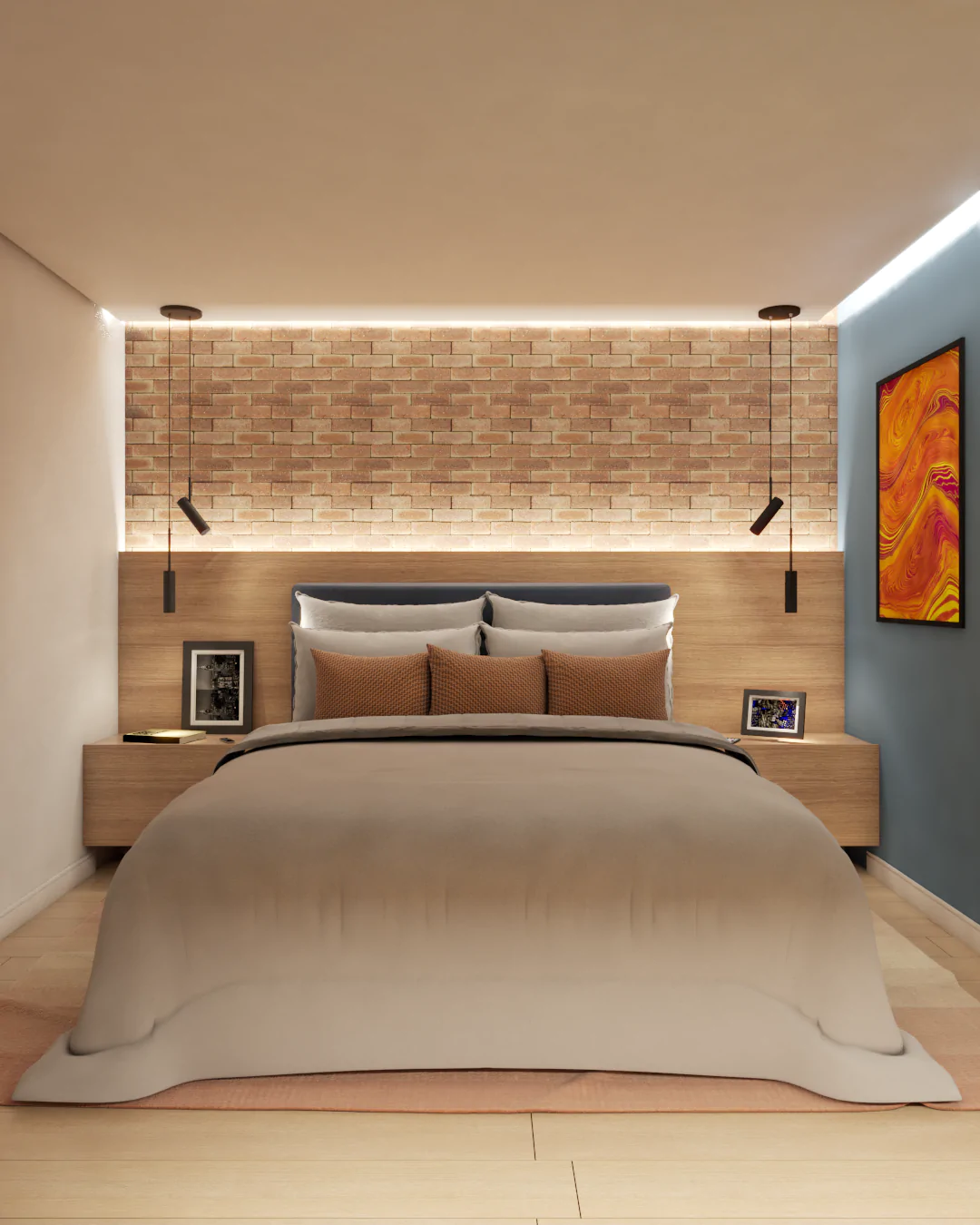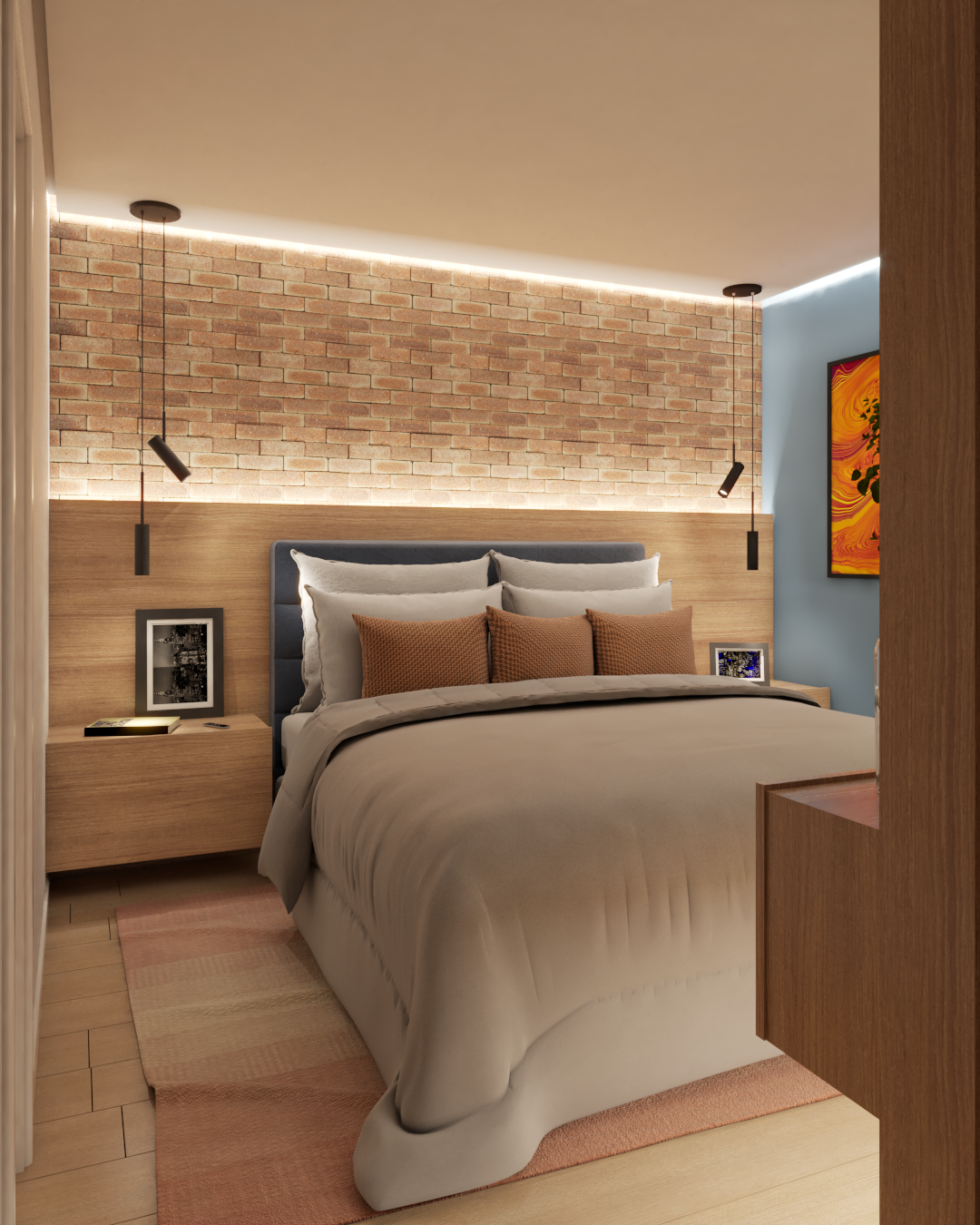 A madeira aparece em abundância, aquecendo os ambientes e dialogando com uma iluminação mais baixa e de tonalidade amarelada, pensada para criar atmosferas íntimas e convidativas. Em contraste, materiais de caráter mais rústico — como o tijolinho e o cimento aparente — reforçam a identidade urbana do projeto. Aqui, o contraste não acontece apenas nas cores, mas também nos acabamentos: o elegante encontra o bruto, a natureza se equilibra com a cidade.