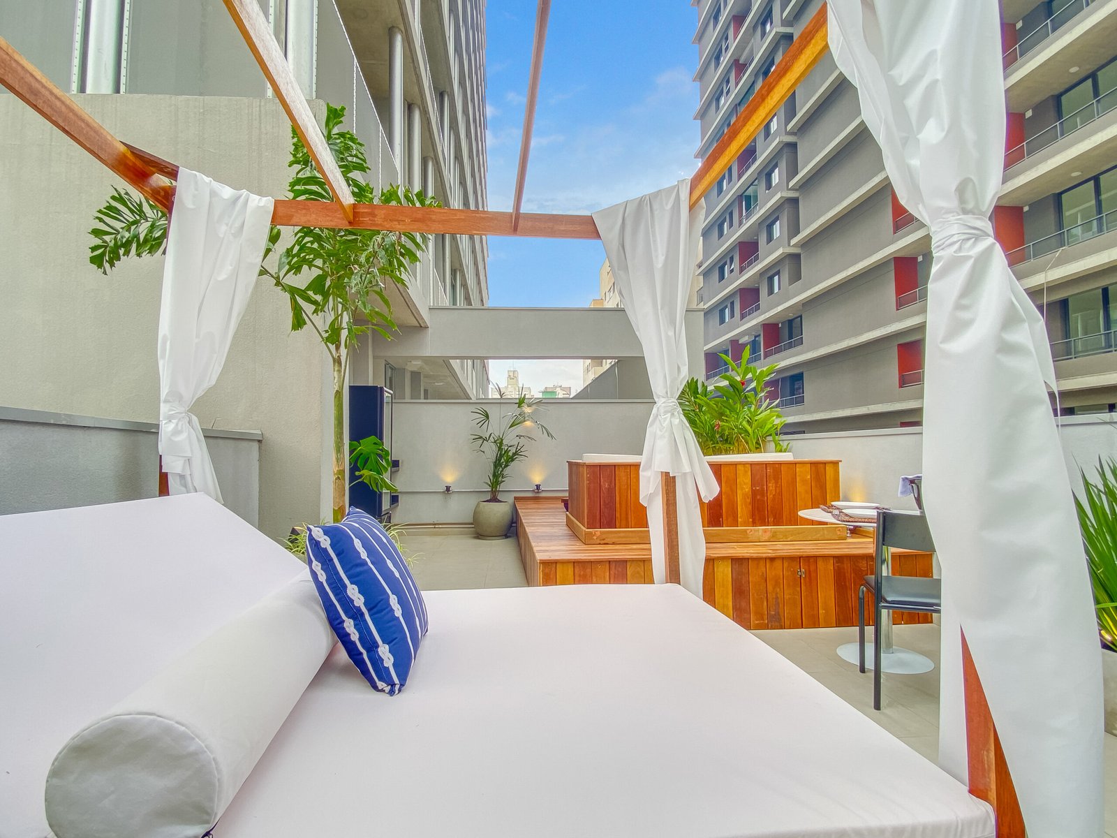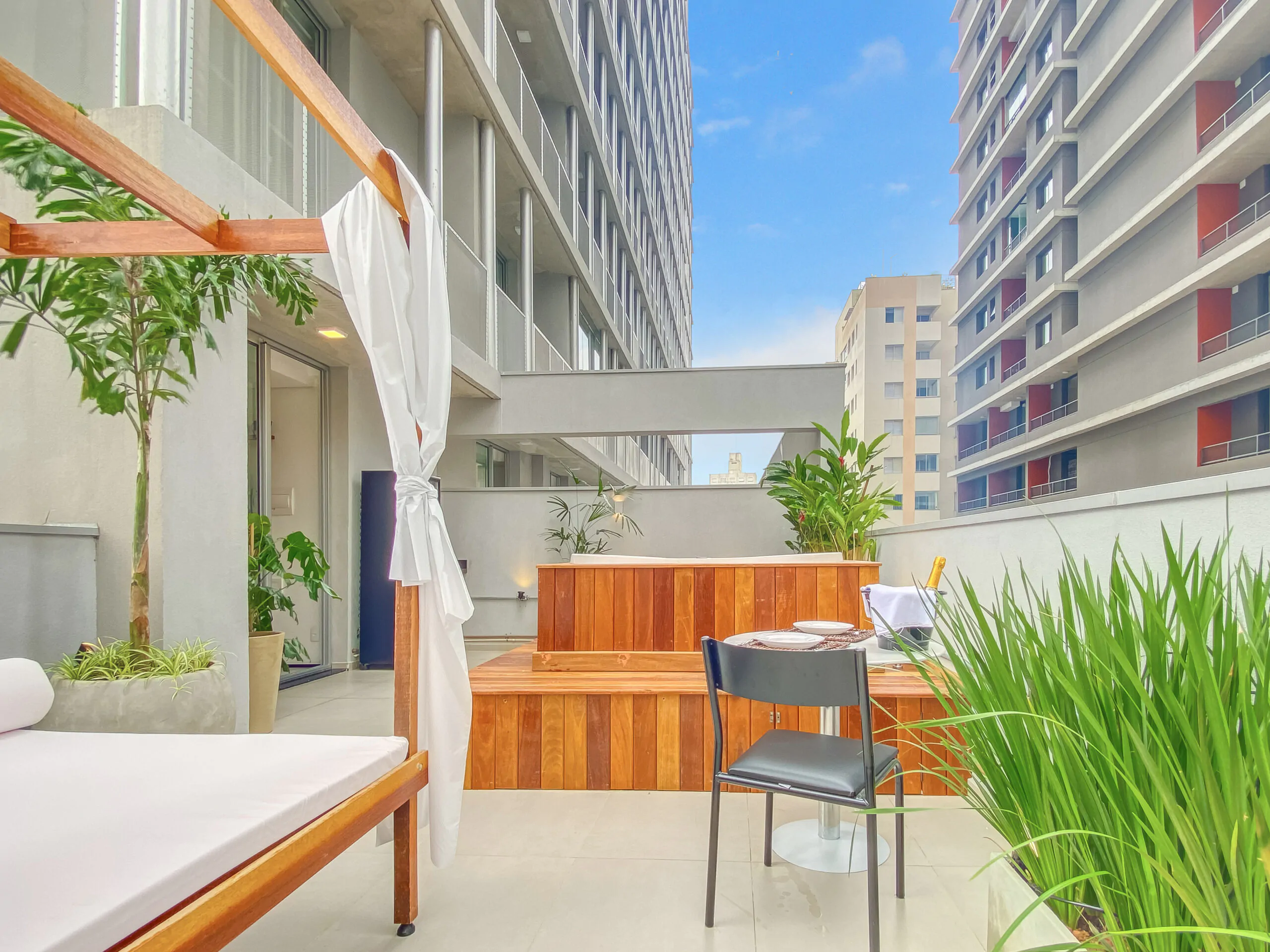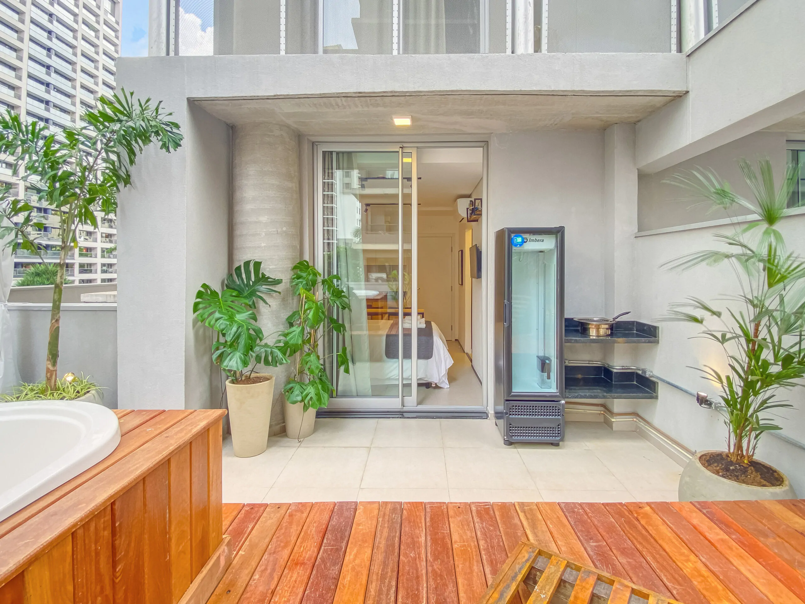 Studio para locação por temporada onde a área externa é protagonista, transformando o espaço em um refúgio verde e privativo no coração de São Paulo.