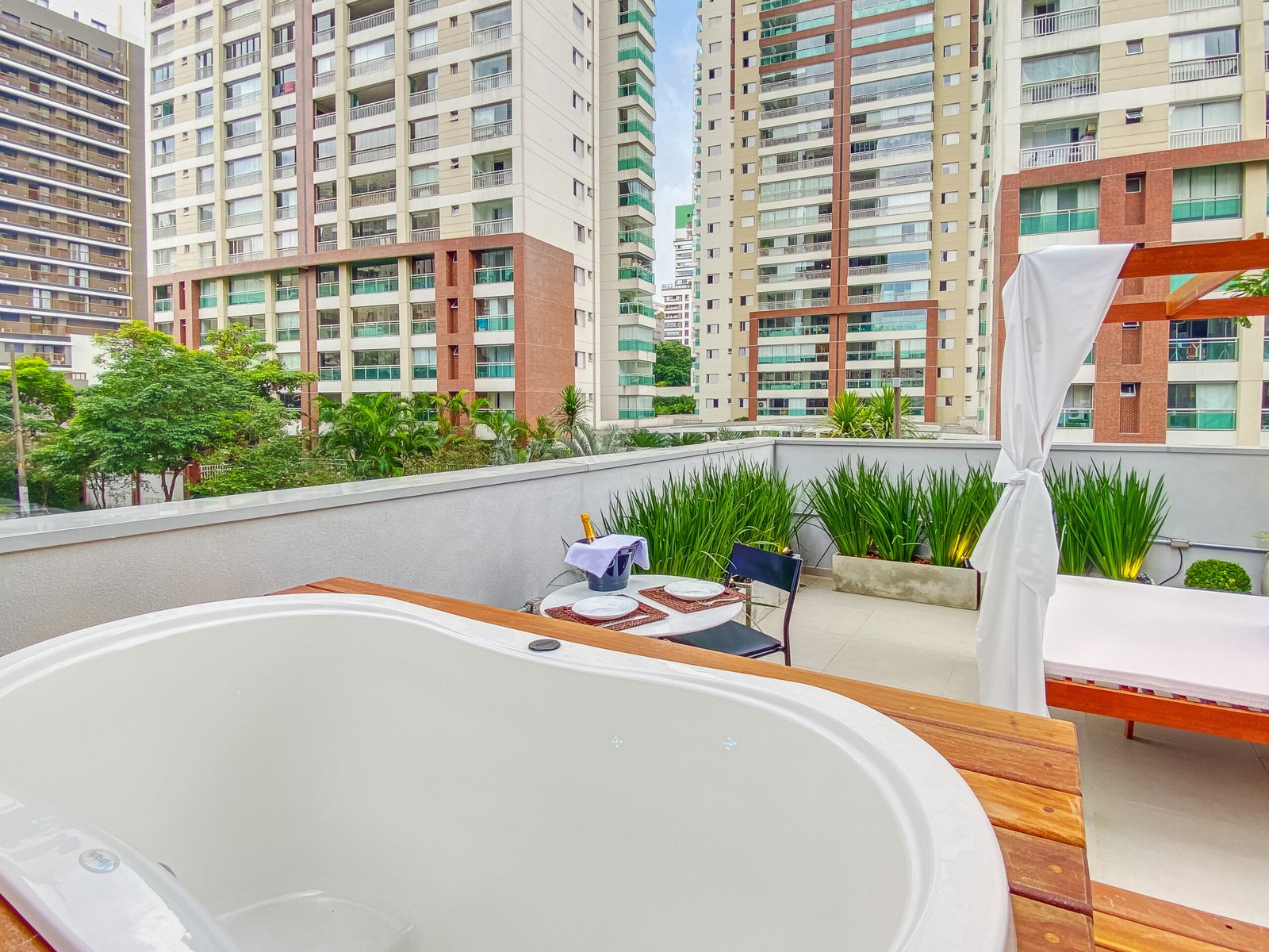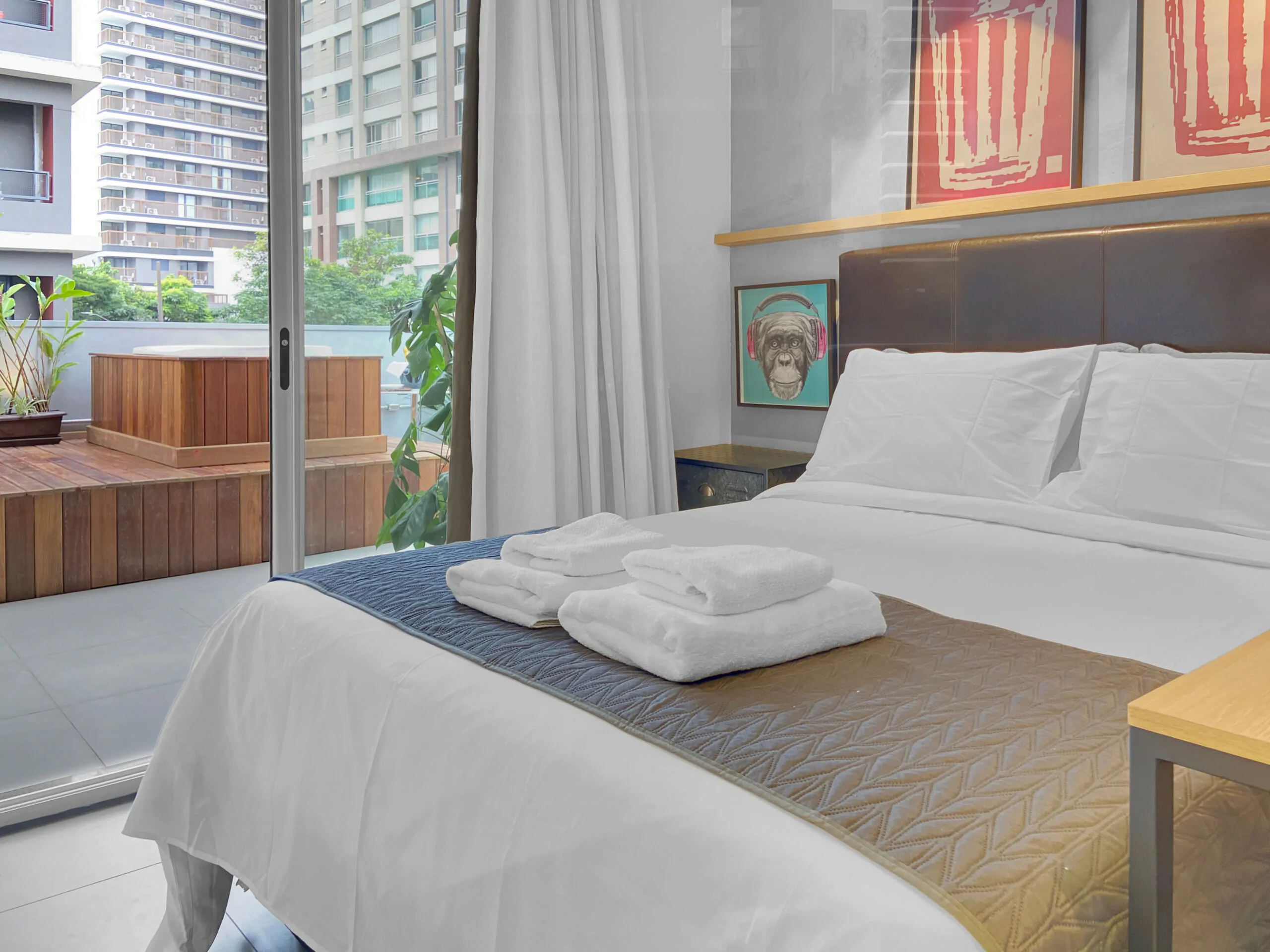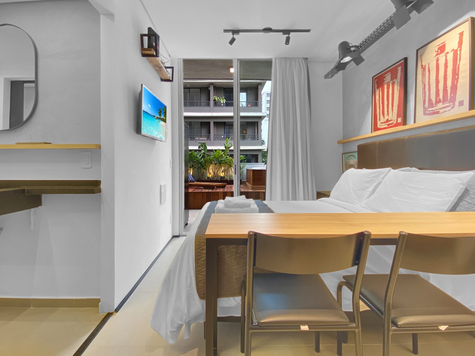 Studio para locação por temporada onde a área externa é protagonista, transformando o espaço em um refúgio verde e privativo no coração de São Paulo.