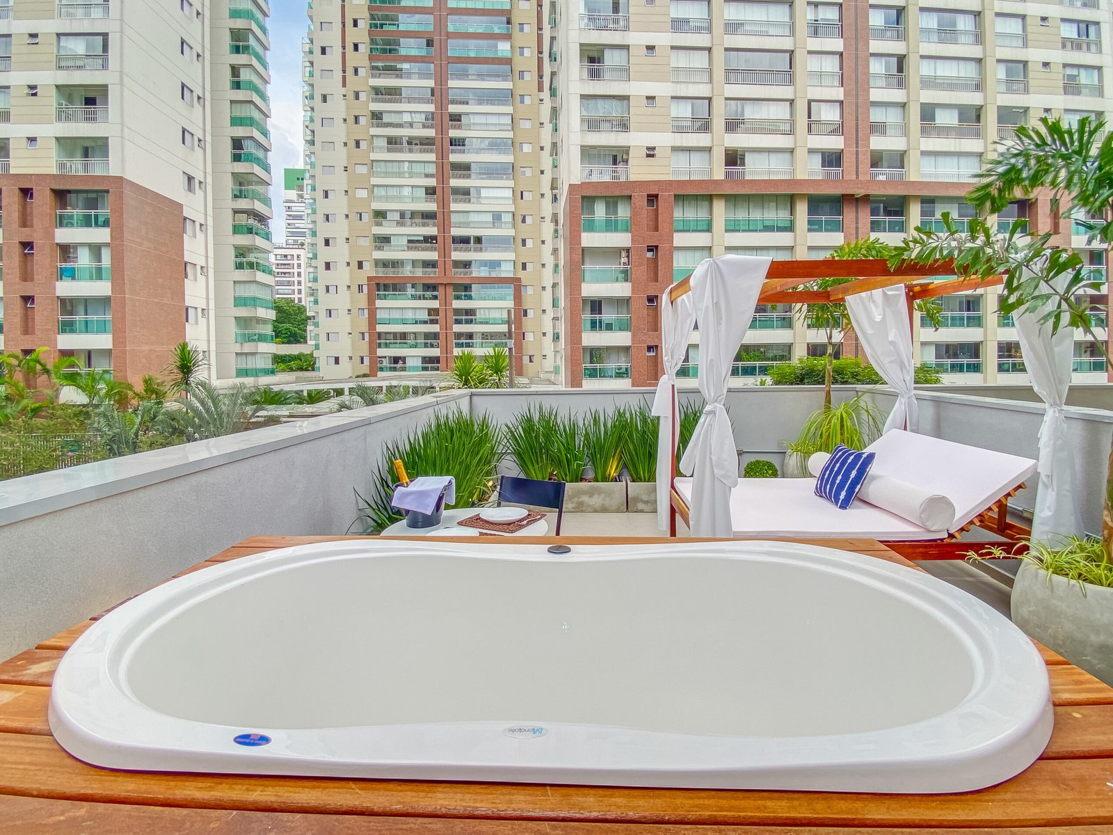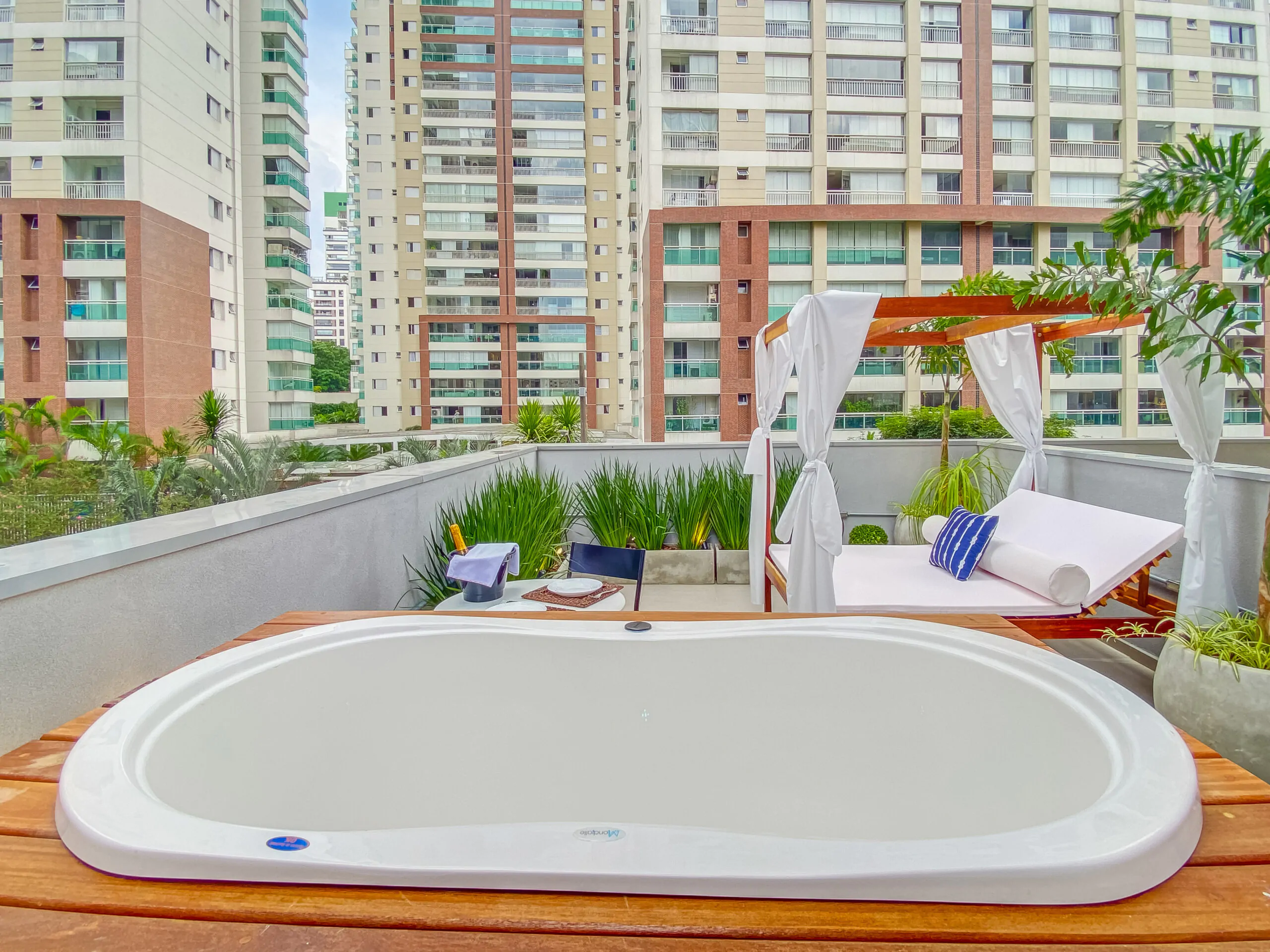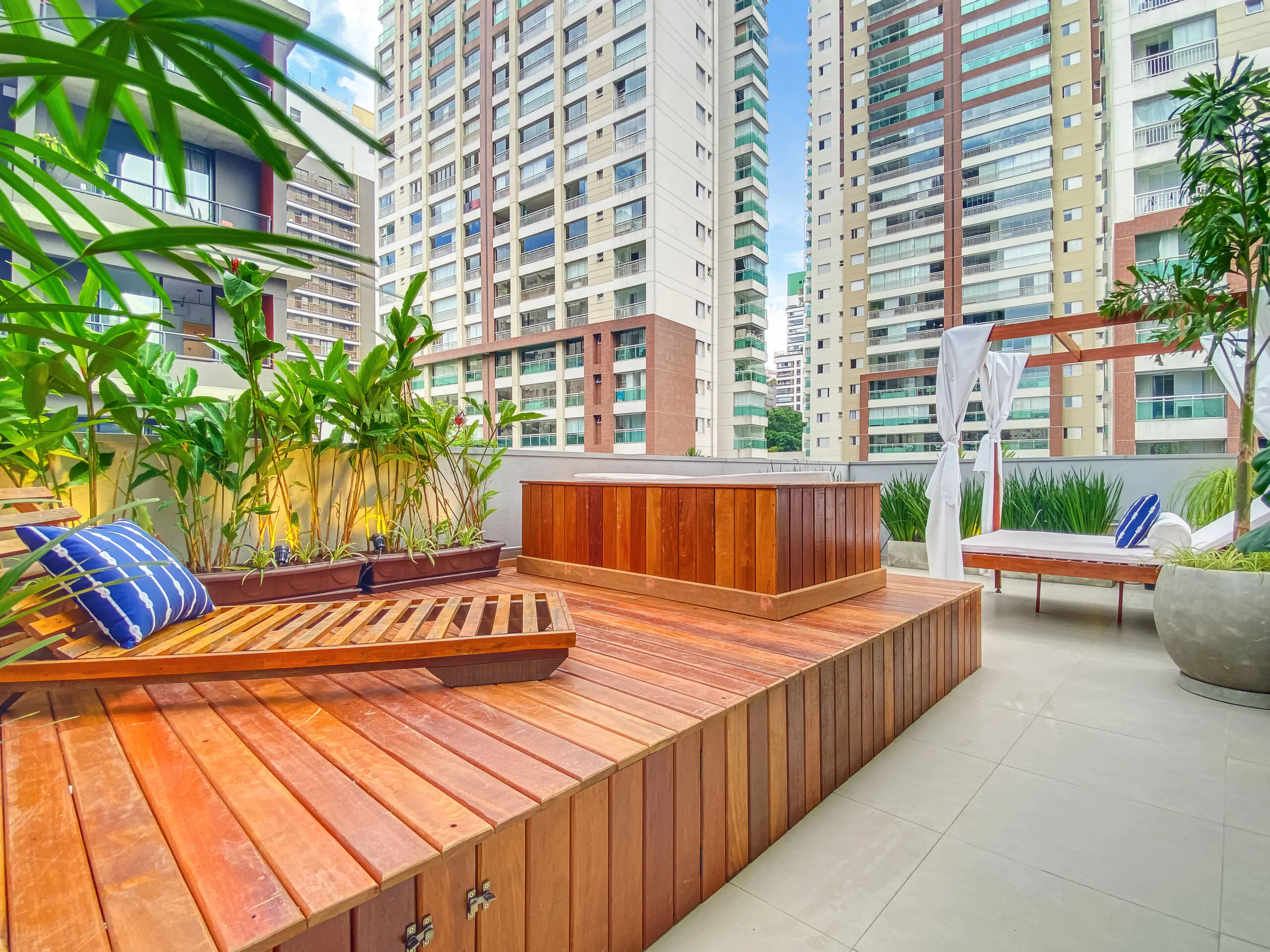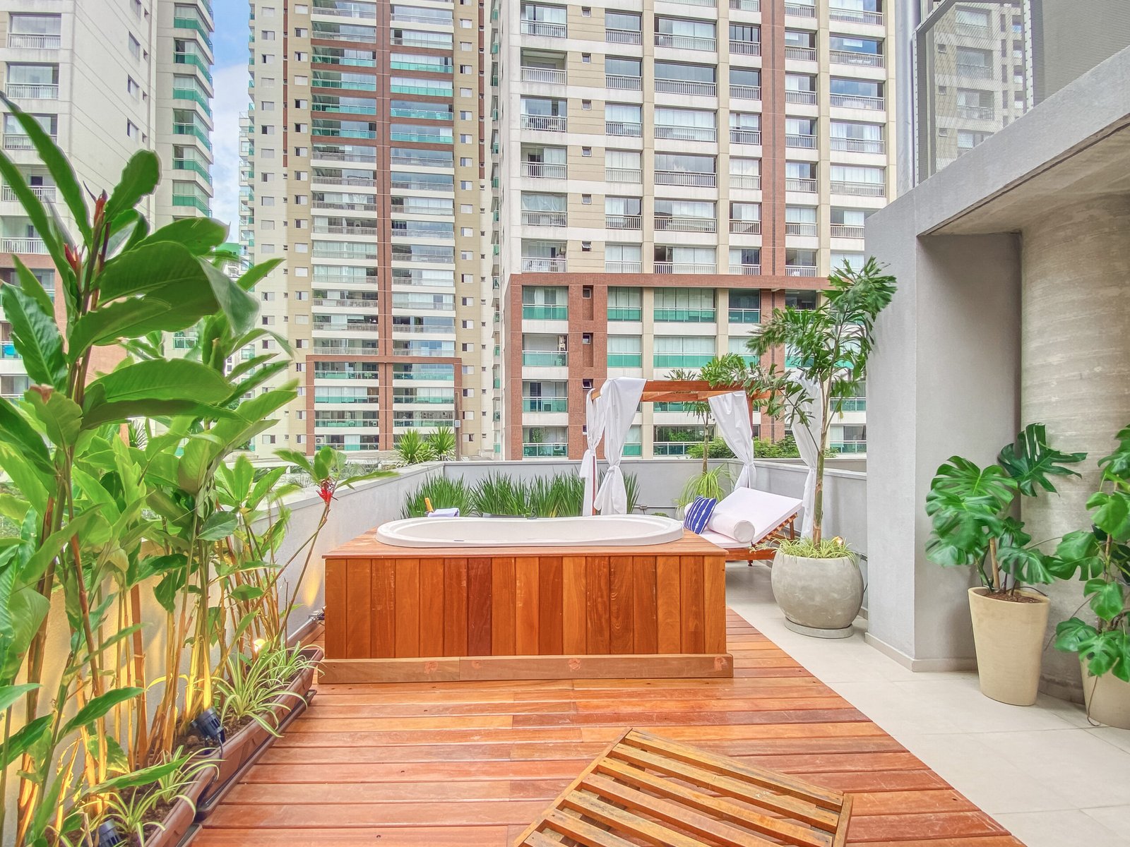 Neste projeto, o ponto de partida foi claro: valorizar a área externa, que possui mais que o dobro da metragem do studio. Em meio à intensidade de São Paulo, a proposta foi criar um espaço acolhedor, verde e intimista — um verdadeiro refúgio urbano para relaxar, receber amigos, aproveitar a banheira ou simplesmente desacelerar.