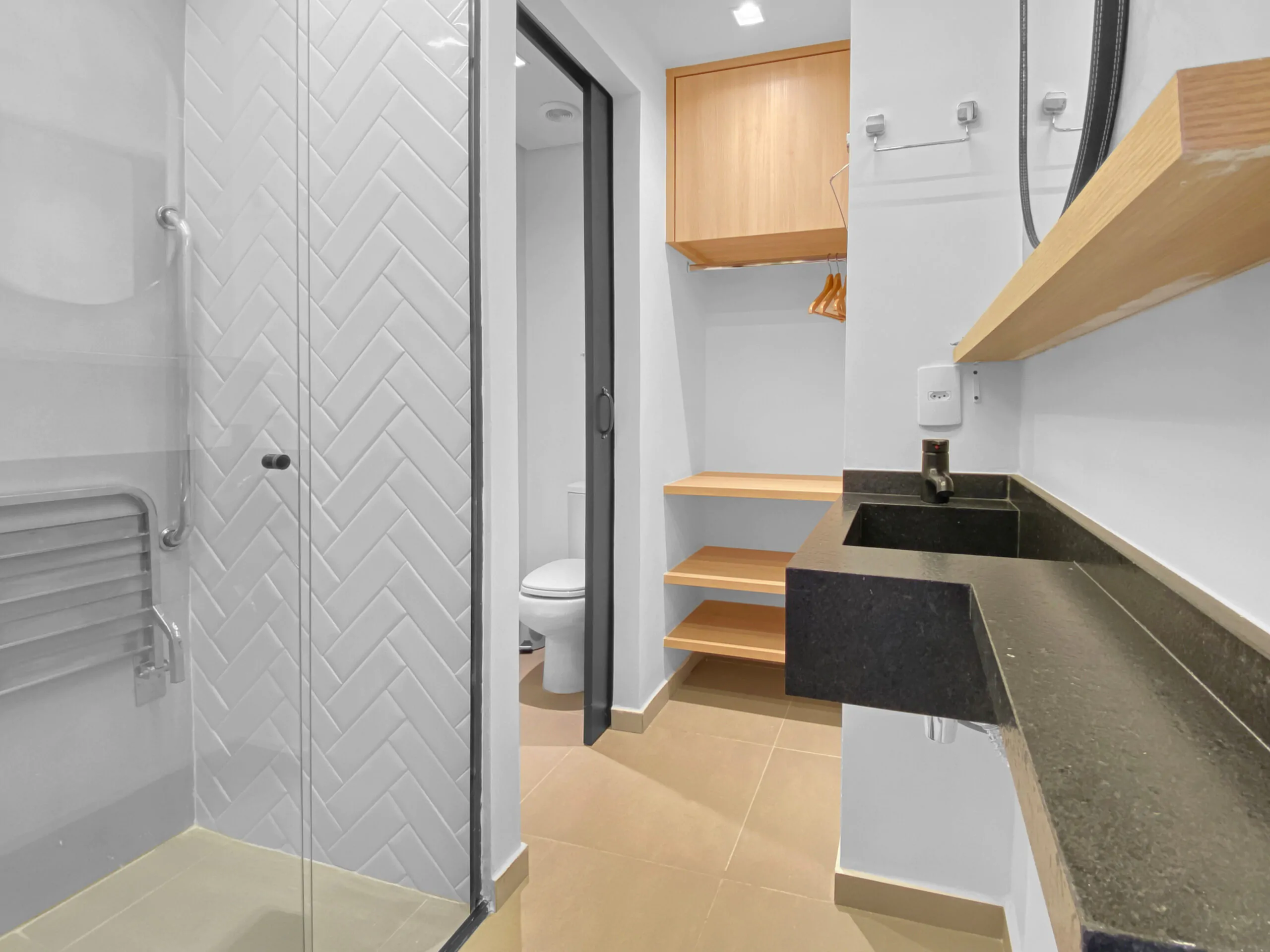 O grande diferencial está no banheiro. Para ampliar a sensação de espaço, o chuveiro foi integrado ao quarto de forma fluida, junto à bancada, enquanto apenas a área da bacia sanitária permanece isolada. Essa solução potencializa a amplitude, traz leveza ao layout e reforça a ideia de um studio contemporâneo, funcional e surpreendente.