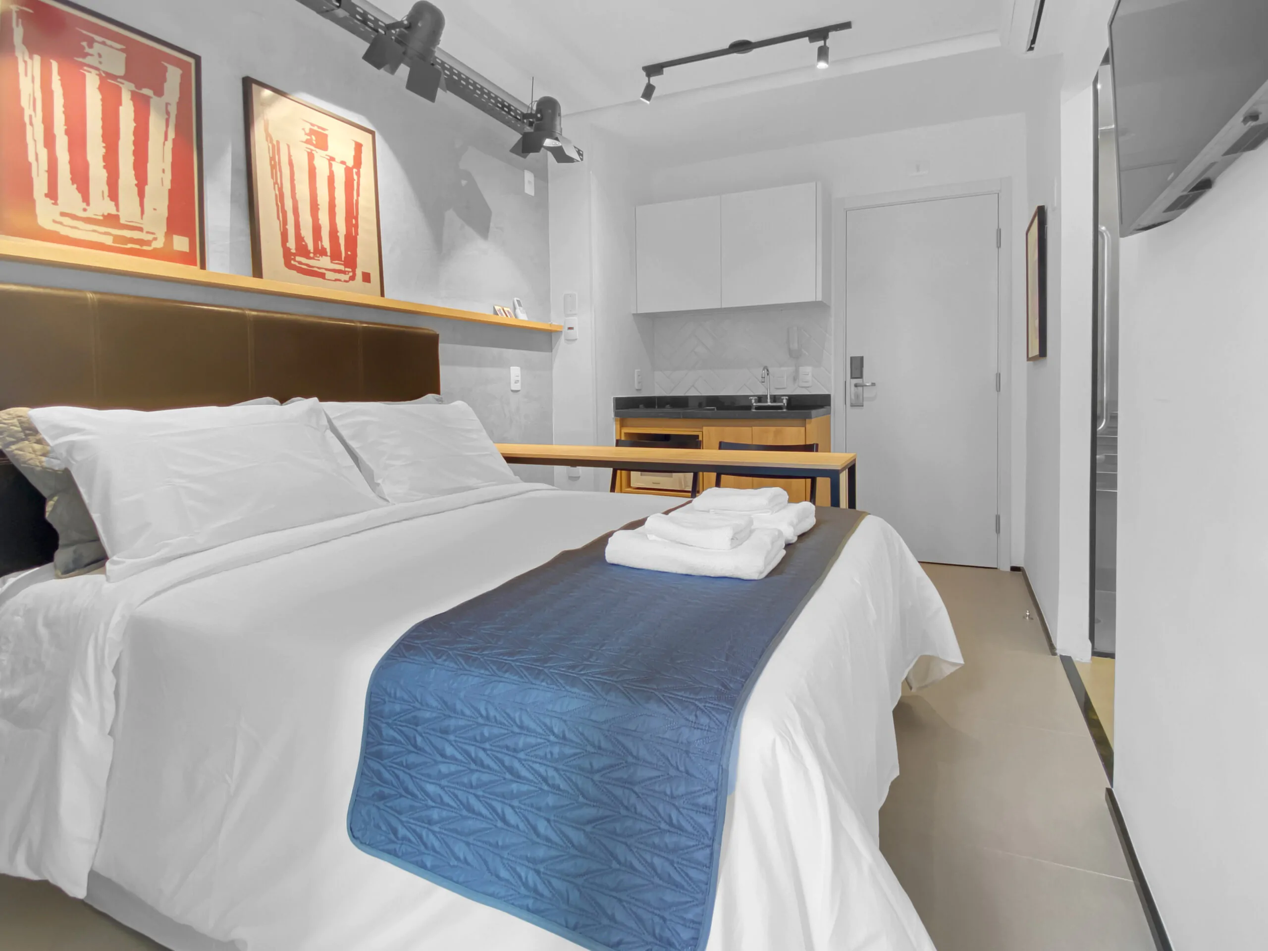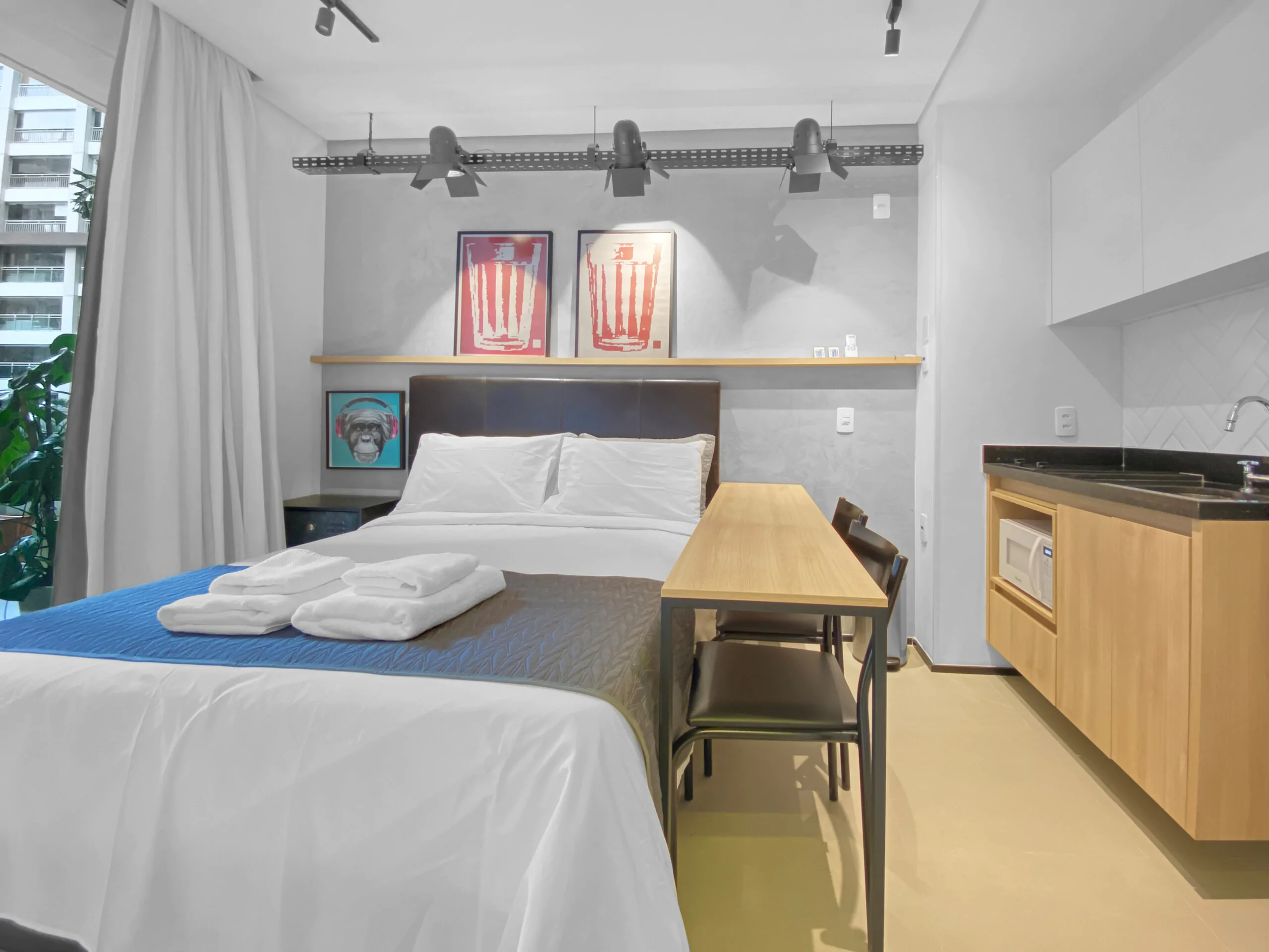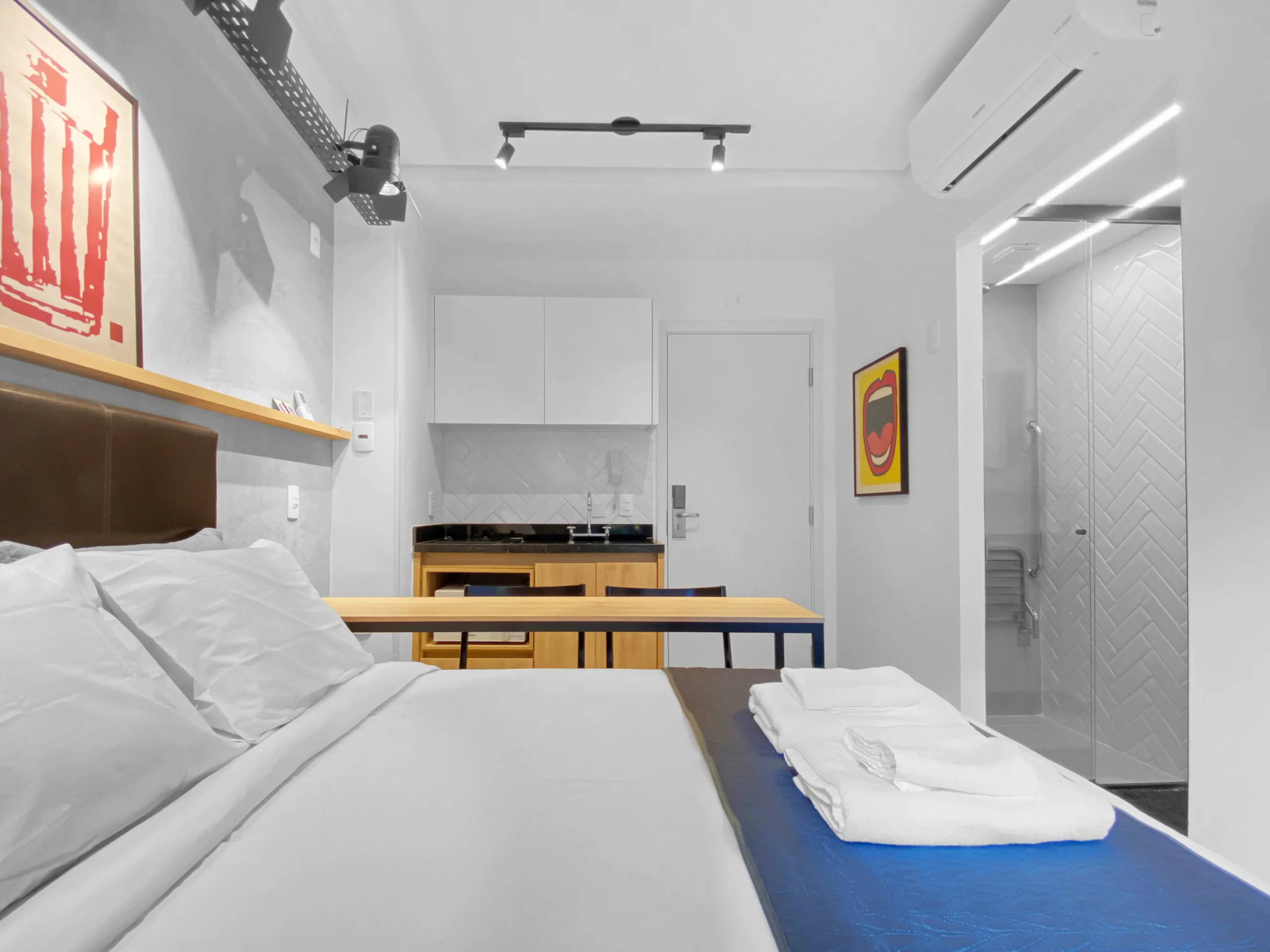 No interior do studio, com 22m², o projeto segue uma linguagem clean e urbana, pensada justamente para não competir com a força do espaço externo. A neutralidade dos materiais cria equilíbrio e permite que o olhar e a experiência se expandam naturalmente para fora.